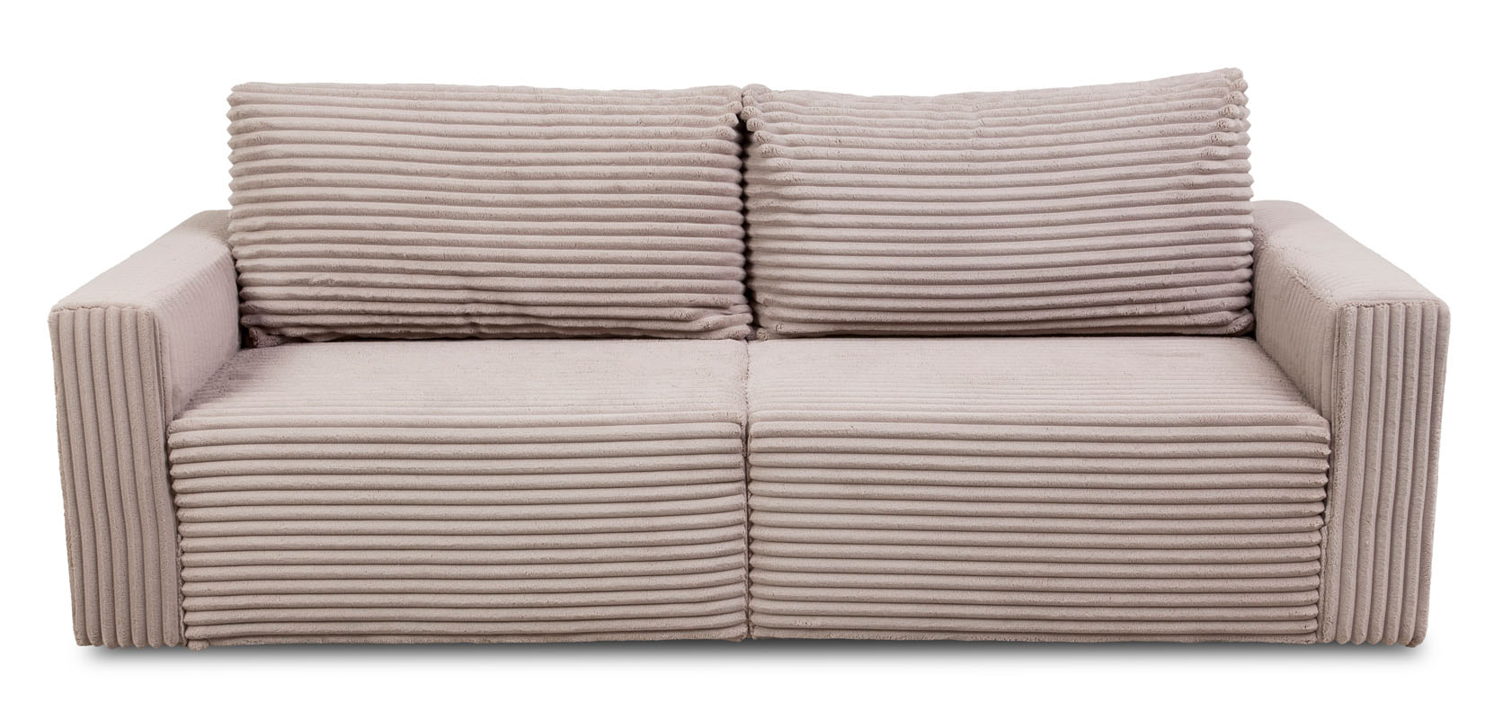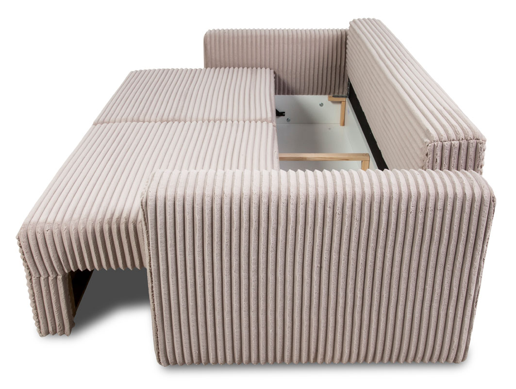 Jedną z najważniejszych cech tego produktu jest jego funkcja spania, która umożliwia błyskawiczne przekształcenie sofy w wygodne łóżko. Automat wspomagający rozkładanie sprawia, że proces ten staje się niezwykle prosty i intuicyjny. Dodatkowym atutem jest pojemnik na pościel, który pomaga utrzymać porządek w salonie, pozwalając na przechowywanie pościeli czy dodatkowych poduszek.