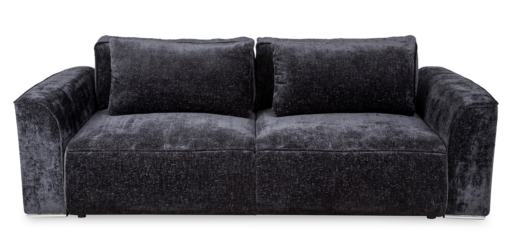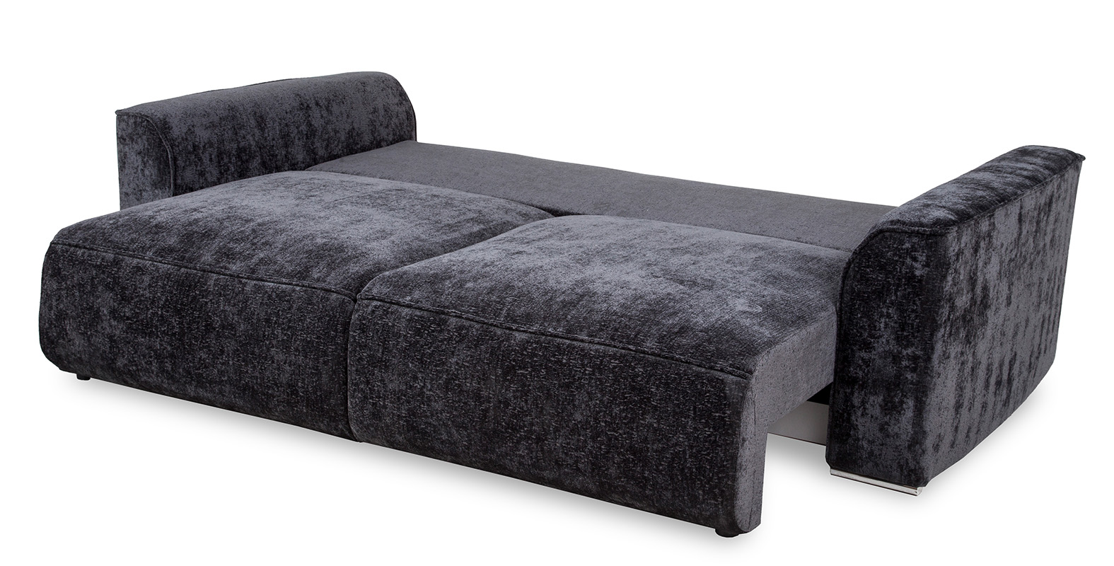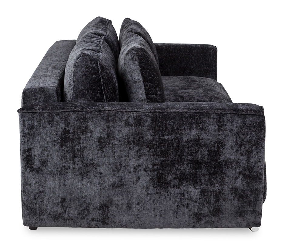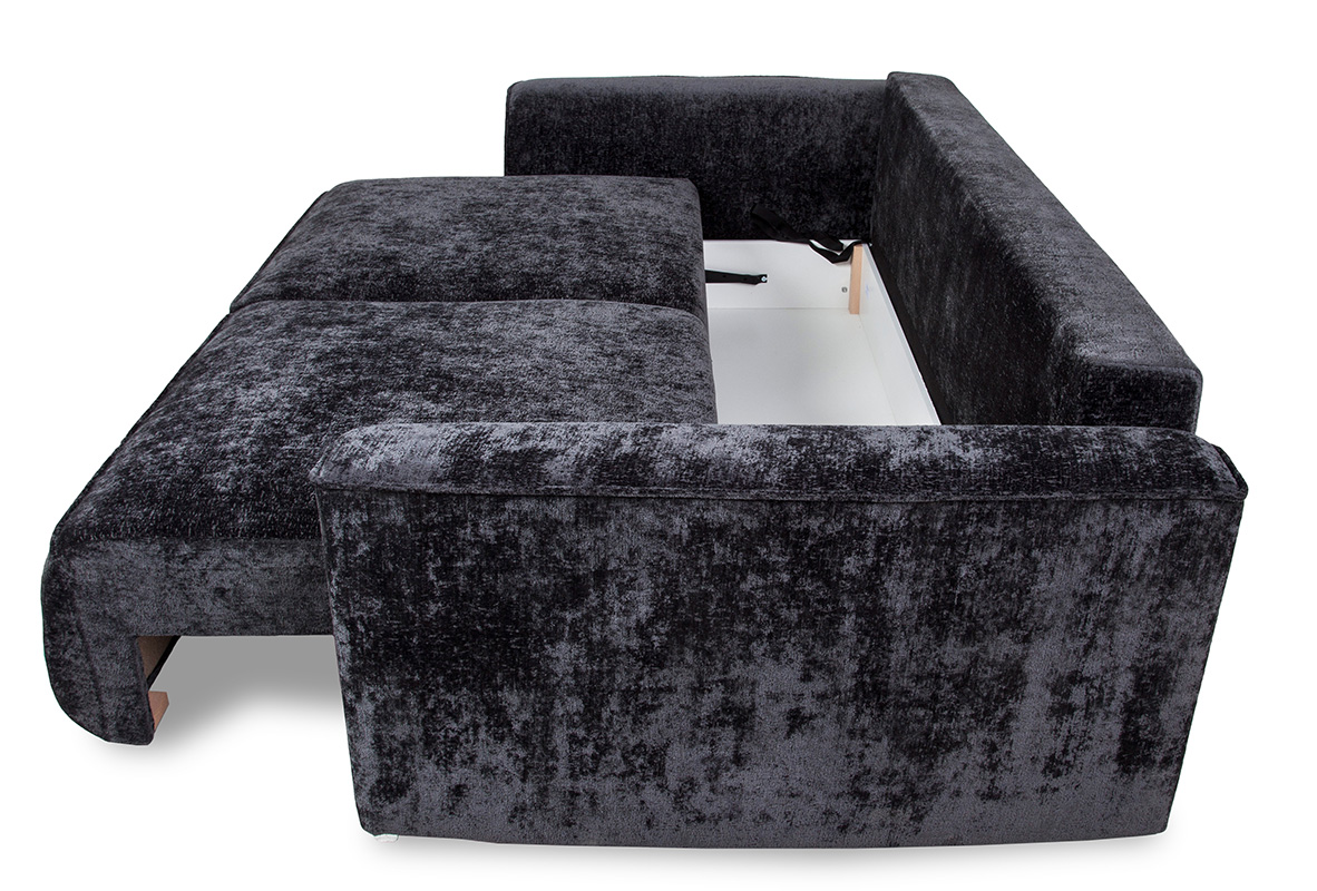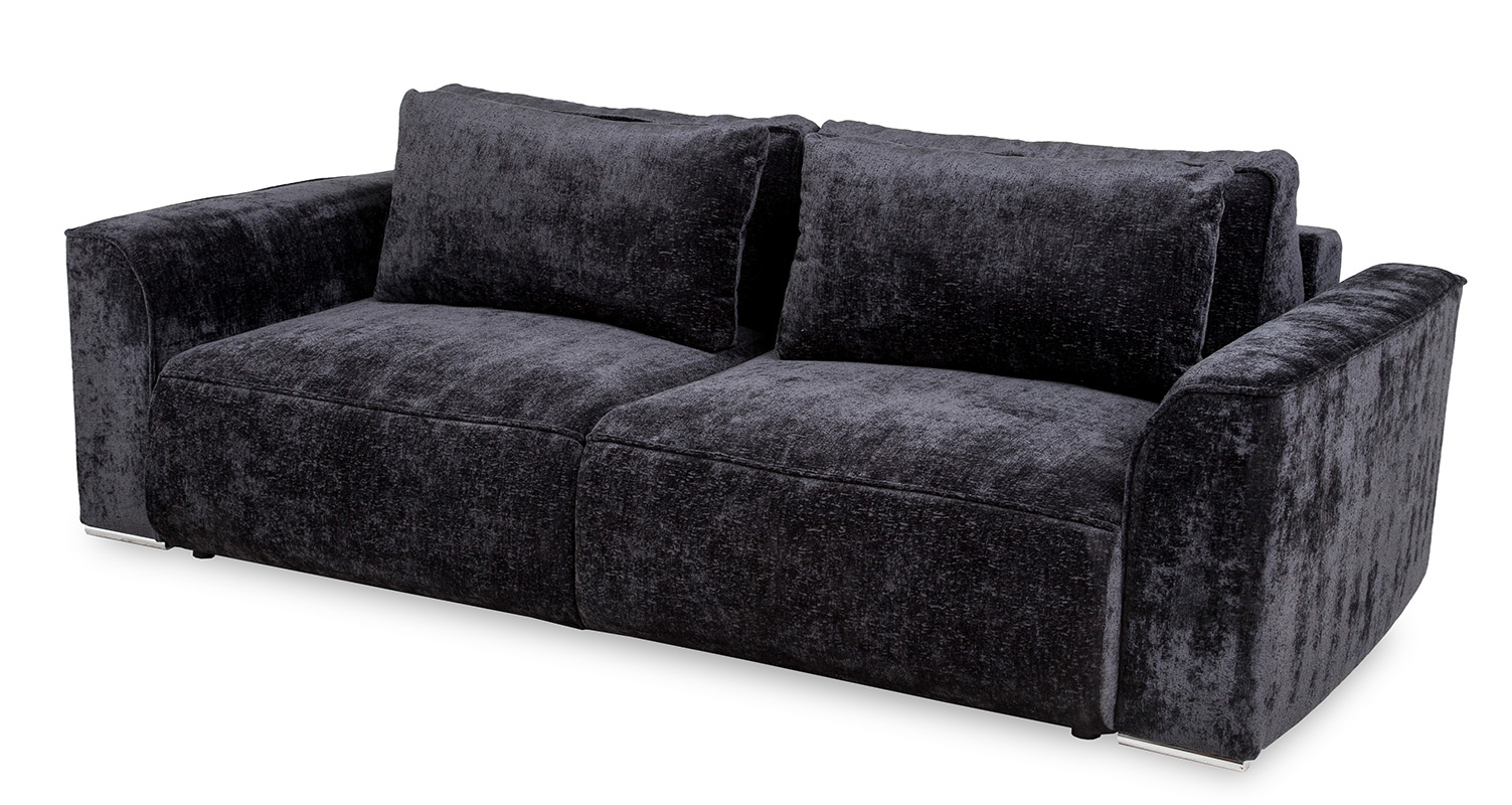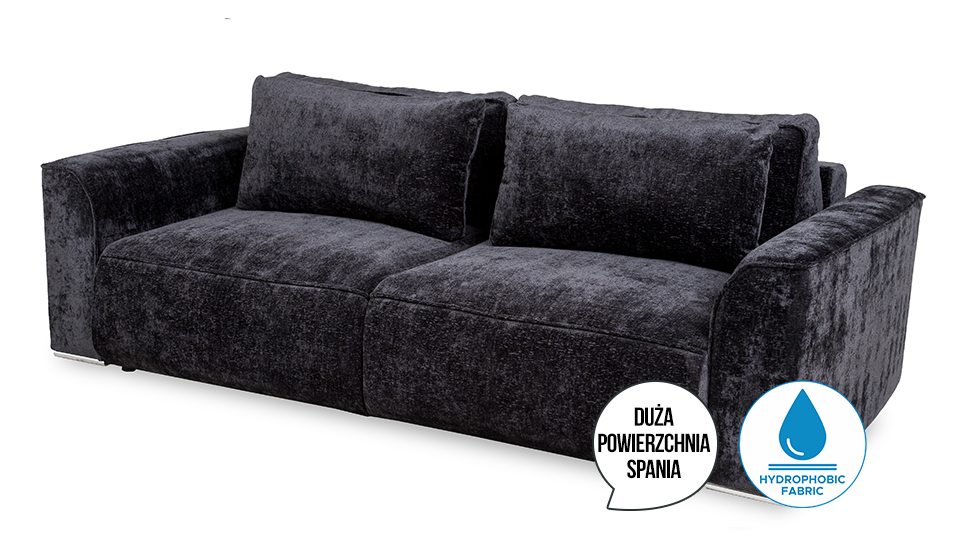 Sofa rozkładana Mars Lux to sofa trzyosobowa z pojemnikiem na pościel. Komfort użytkowania zapewniają podwójne sprężyny, bonell i sprężyna falista. Sofa wykonana w tkaninie Trenza w kolorze czarnym. Tkanina ta charakteryzuje się wysoką jakością jest miękka w dotyku, wodoodporna oraz jest trudnozapalna. Sposób rozkładania DL. Sofa posiada dużą powierzchnie spania, po rozłożeniu wynosi ona 160x197 cm. Mebel w komplecie posiada cztery poduszki oparciowe. Sofa na nóżkach z tworzywa sztucznego w kolorze chrom.