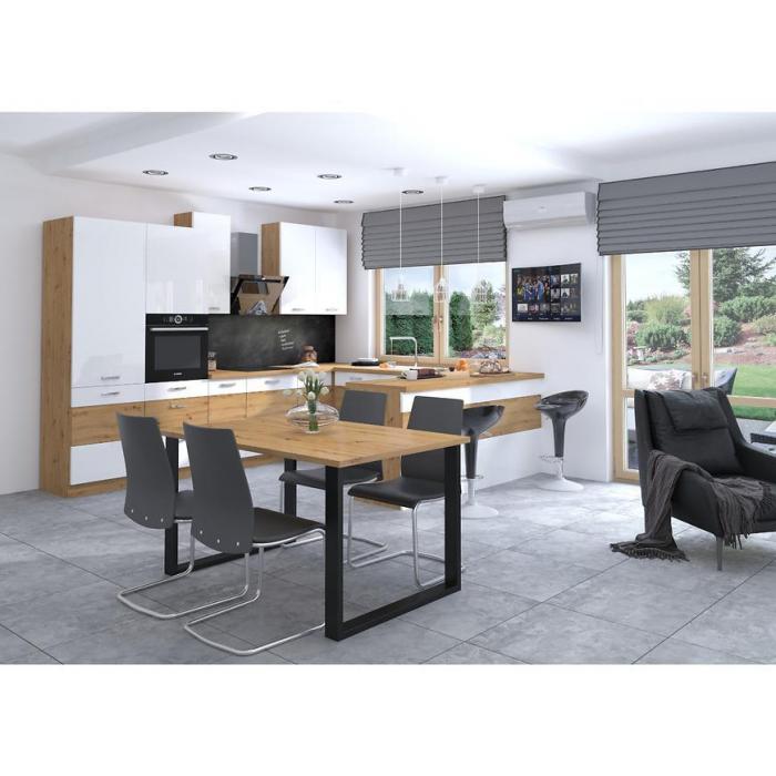 Kolekcja mebli do kuchni Modena to doskonałe rozwiązanie dla osób poszukujących wysokiej jakości i nowoczesnego wyposażenia kuchni. Wykonane z płyty wiórowej laminowanej, te meble gwarantują trwałość i solidność, co przekłada się na długotrwałą użytkowość. Dostępne w dekorze czarny/dąb artisan, prezentują się elegancko i nowocześnie, wprowadzając do kuchni wyjątkową atmosferę.