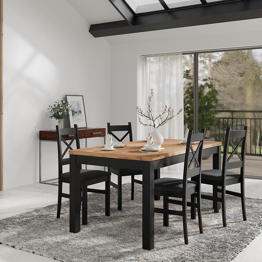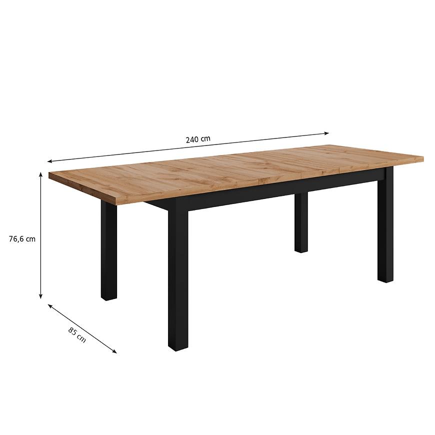 Blat stołu wykonany jest z wytrzymałej płyty wiórowej laminowanej, która zapewnia odporność na codzienne zużycie i łatwość w utrzymaniu czystości. Jego prostokątny kształt i matowe wykończenie dodają elegancji oraz subtelnej prostoty, która wpasuje się w różnorodne aranżacje wnętrz, od klasycznych po nowoczesne. Jasne drewnopodobne wybarwienie blatu dodaje stołu naturalnego charakteru, nadając pomieszczeniu ciepłą, przytulną atmosferę.