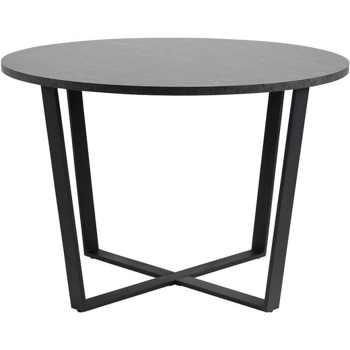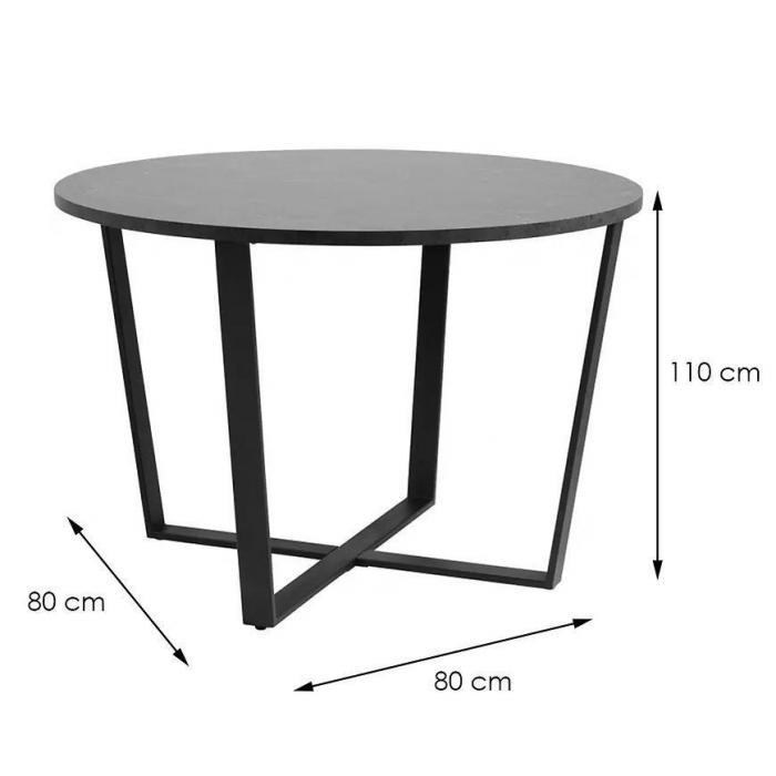 Okrągły stół 110x75 cm, blat MDF w kolorze czarny marmur, matowe wykończenie, nierozkładany, stelaż metalowy, styl nowoczesny, komfortowy dla 4-6 osób, łatwy w utrzymaniu.