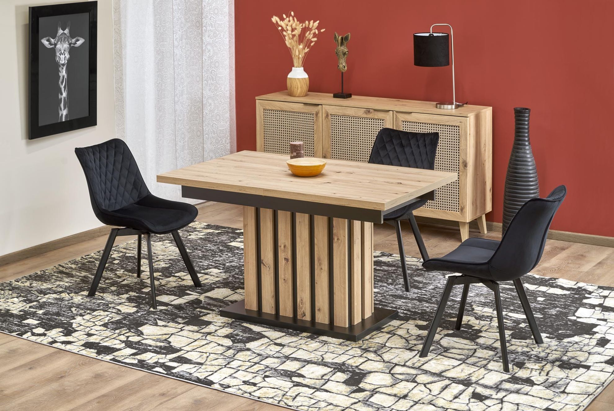 Stylowy dąb artisan w połączeniu z czarnymi detalami nadaje stołowi Apollo 160 nowoczesny i elegancki wygląd, który doskonale wpisuje się w różnorodne aranżacje wnętrz. Odkryj możliwości aranżacyjne z stołem rozkładanym Apollo 160 i stwórz wyjątkową przestrzeń do wspólnych posiłków i spotkań w swoim domu.