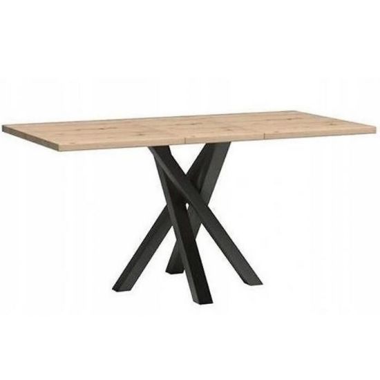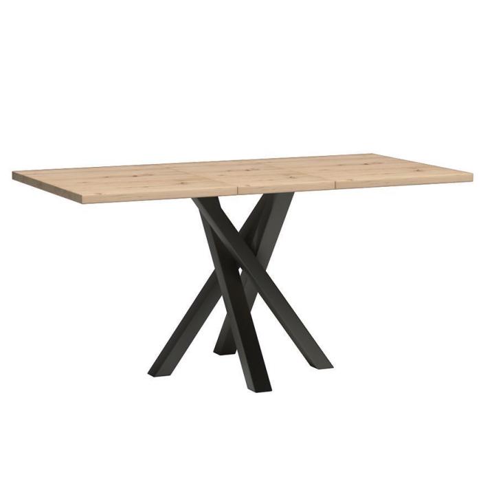 Blat stołu wykonany z laminowanej płyty wiórowej w kolorze dąb artisan jest odporny na codzienne użytkowanie, zarysowania i zabrudzenia. Metalowy stelaż w kolorze czarnym zapewnia stabilność konstrukcji, a jego minimalistyczny design wpisuje się w nowoczesne i loftowe aranżacje. Matowe wykończenie stołu podkreśla jego elegancki charakter i ułatwia utrzymanie w czystości.