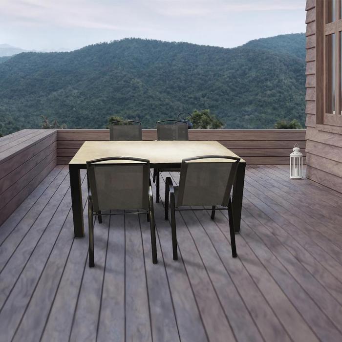 Klasyczny stół ogrodowy, który sprawdzi się również na tarasie. Stół posiada blat ze szkła hartowanego o klasie T6mm tworząc imitację blatu betonowego. Stół jest duży i praktyczny idealny do spotkań z rodziną lub przyjaciółmi.