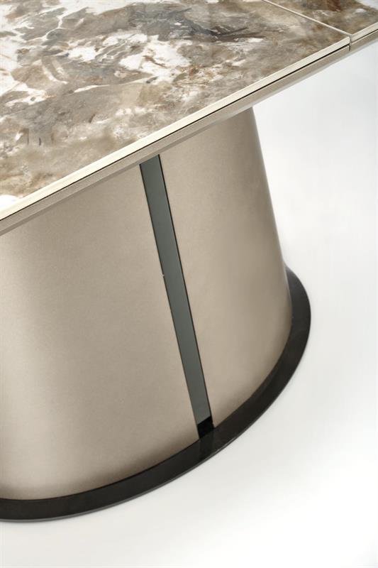 Blat stołu to połączenie ceramiki i lakierowanego MDF. Materiały te gwarantują trwałość, odporność na uszkodzenia oraz łatwość utrzymania czystości. Blat w kolorze beżowego marmuru i cappuccino nadaje elegancji i wyrafinowania. To doskonałe tło dla spotkań przy kawie, przyjęć lub rodzinnych posiłków. Nogi stołu wykonane są z wytrzymałej stali malowanej proszkowo. Ich dwubarwne wykończenie tworzy kontrast, który dodaje charakteru meblowi. Zarówno kolorystyka nóg, jak i solidna konstrukcja, sprawiają, że stół emanuje nowoczesnością i stylowym designem.