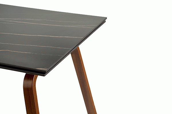 Blat stołu wykonany jest z wysokiej jakości materiału spiekowego, który charakteryzuje się wyjątkową trwałością i odpornością na uszkodzenia. Czarny marmurowy kolor blatu nadaje stołowi elegancji i luksusowego wyglądu, tworząc efektowny akcent we wnętrzu.