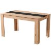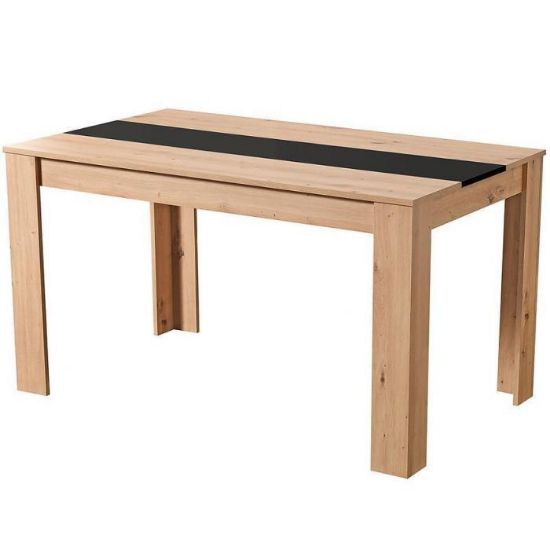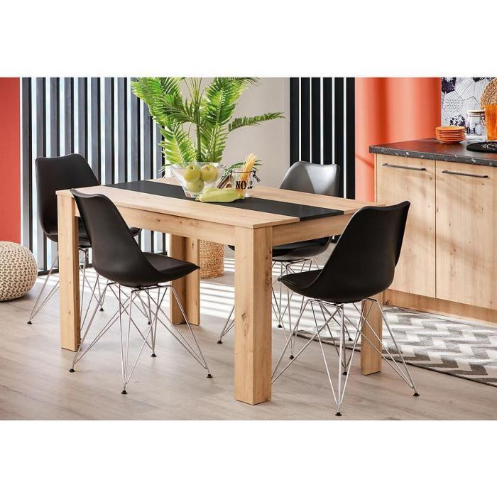 Prostokątny stół dla 4 osób, matowy blat laminowany, trwała konstrukcja z płyty wiórowej, kolor dąb artisan/czarny, nowoczesny design, mebel idealny do kuchni i jadalni, wymaga samodzielnego montażu.