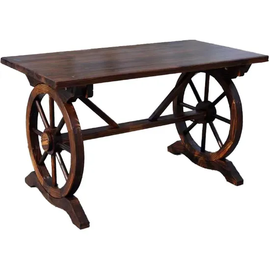 Stół ogrodowy w rustykalnym stylu, wykonany z naturalnego drewna jodłowego o głębokim, opalanym wykończeniu. Jego ciemny kolor z subtelnymi, jaśniejszymi akcentami nie tylko wyróżnia się na tle innych mebli ogrodowych, ale także dodaje uroku każdemu otoczeniu. Wyjątkowe nogi z wbudowanymi kołami od wozu zapewniają stabilność i charakterystyczny wygląd.
