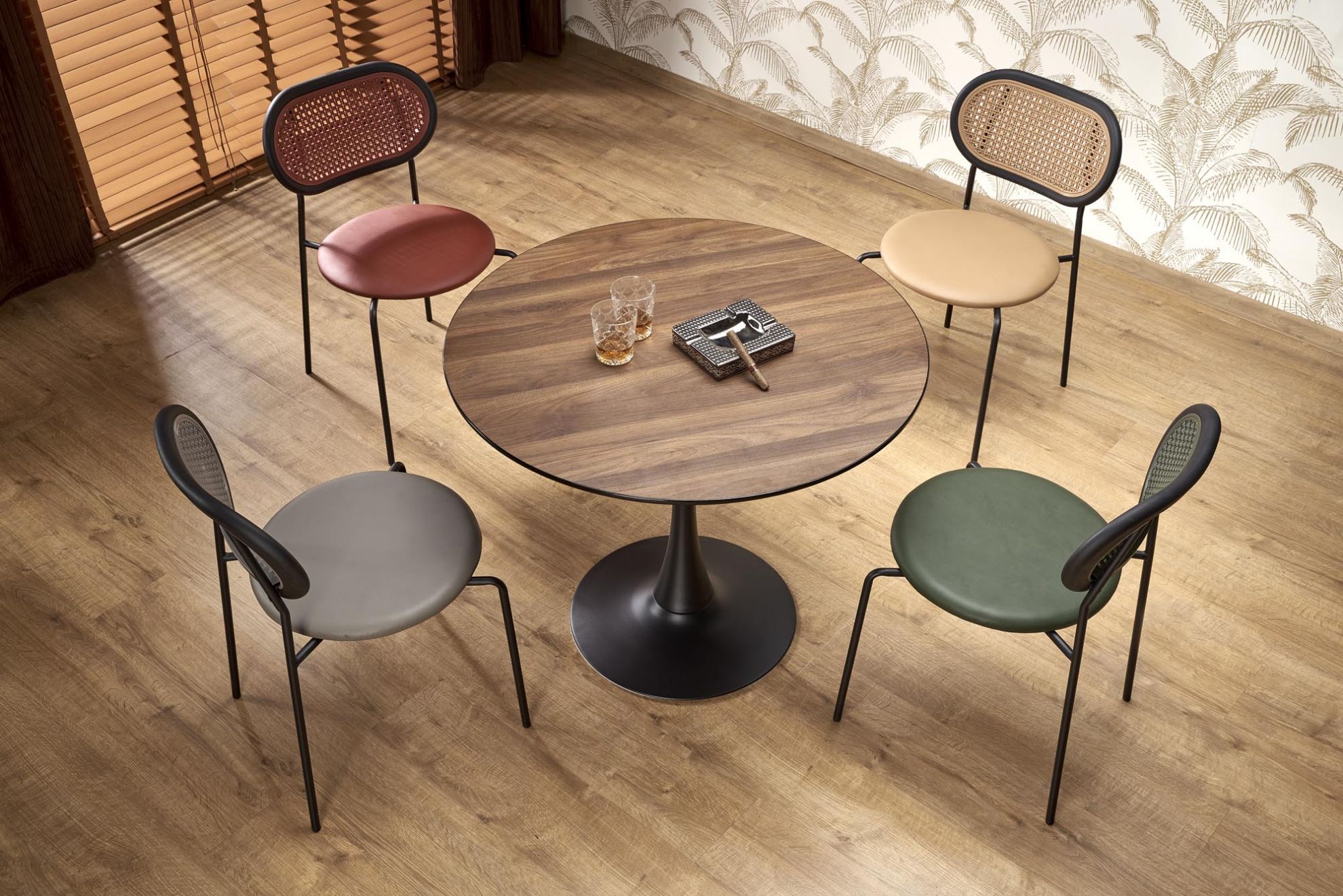Blat stołu wykonany jest z trwałego MDF-u okleinowanego w kolorze orzechowym. MDF zapewnia wytrzymałość i stabilność, a okleina orzechowa nadaje mu naturalny wygląd drewna. Kolor orzechowy blat sprawia, że stół wydaje się ciepły i przytulny, dodając elegancji do wnętrza.