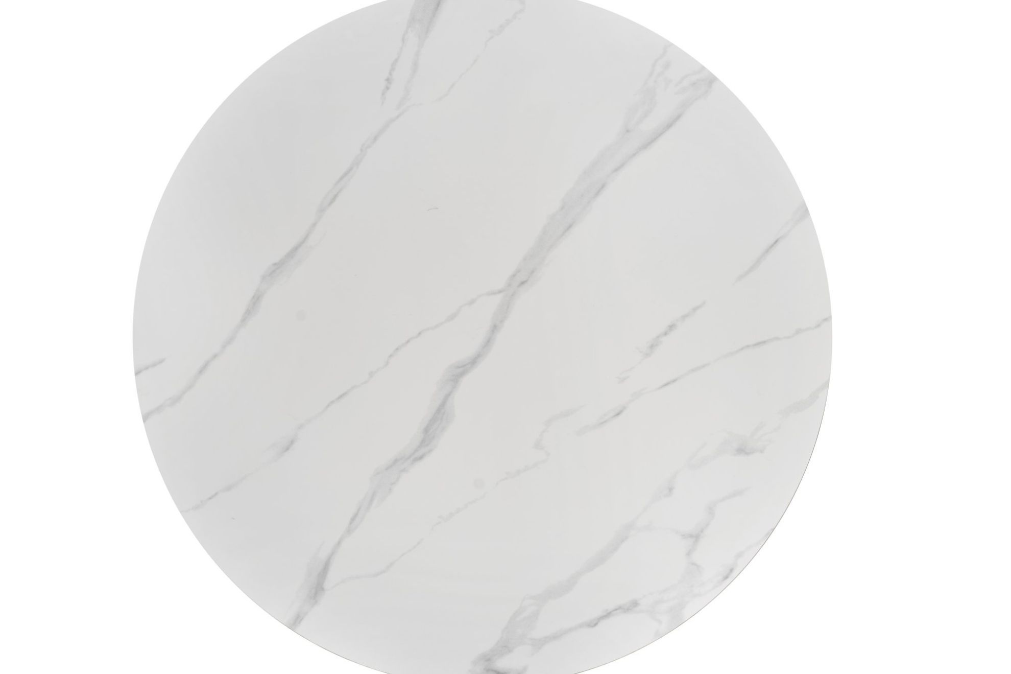 Blat stołu wykonany jest ze spieku, które imituje efekt białego marmuru, nadając całej konstrukcji elegancji i stylu. Solidne nogi ze stali nierdzewnej w kolorze srebrnym dodają lekkości i nowoczesności, tworząc harmonijne połączenie z blatem.