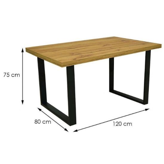 Stół ma szerokość 80 cm, długość 120 cm i wysokość 75 cm. To idealne rozwiązanie dla 4 osób, zapewniające komfortowe użytkowanie w kuchni, jadalni czy niewielkim salonie.