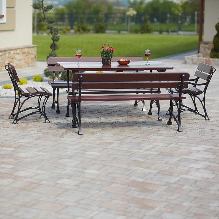 Stół ogrodowy Królewski to stół, który idealnie wpasuje się w design ogrodu, balkonu czy tarasu. Wykorzystany materiał to aluminium i drewno olchowe, co sprawia, że jest solidny i wytrzymały. Odporny na promieniowanie UV i niekorzystne warunki atmosferyczne. Drewno jest dwukrotnie zaimpregnowane, natomiast aluminium pomalowane jest proszkowo farbą antykorozyjną.
