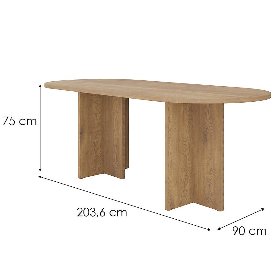 Owalny kształt blatu nie tylko prezentuje się nowocześnie, ale również sprzyja wygodnemu użytkowaniu. Brak ostrych krawędzi sprawia, że stół Loen jest bezpiecznym wyborem do domów, w których liczy się komfort codziennego życia. Szerokość 90 cm oraz długość 203,6 cm zapewniają odpowiednią przestrzeń dla kilku osób, umożliwiając swobodne spożywanie posiłków czy spotkania w gronie bliskich.