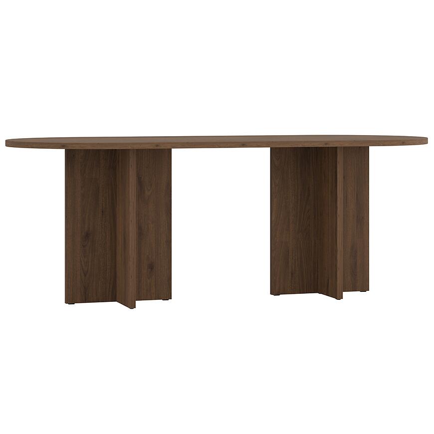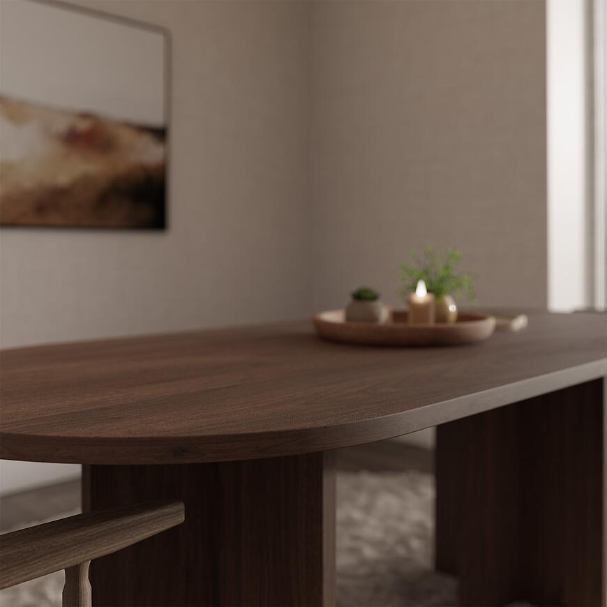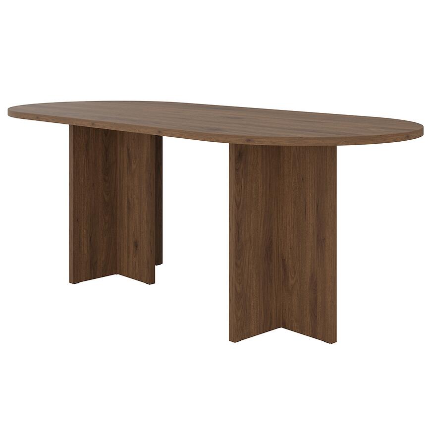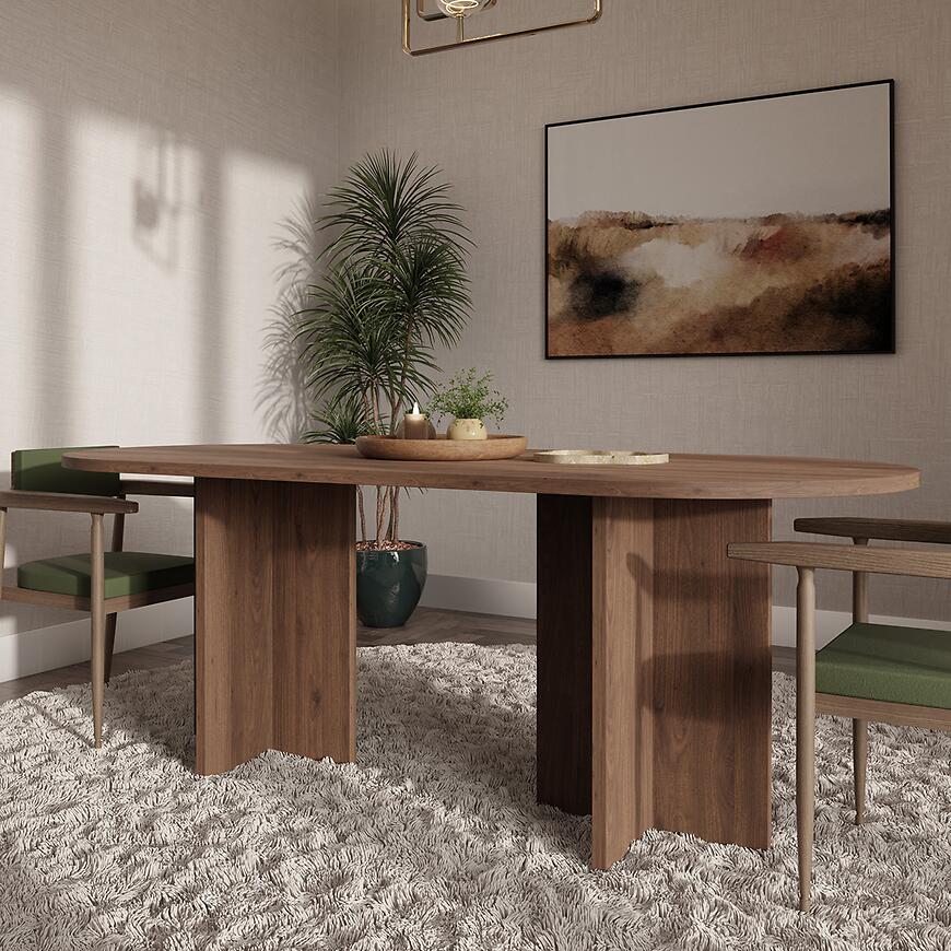 Stół Loen 204x90 cm w kolorze orzech okapi to propozycja dla osób, które cenią minimalistyczne formy i funkcjonalne rozwiązania w aranżacji wnętrz. Dzięki owalnemu blatowi i matowemu wykończeniu doskonale wpisuje się w nowoczesne przestrzenie, dodając im lekkości i elegancji. To idealny stół do jadalni, salonu lub otwartej kuchni, gdzie liczy się zarówno estetyka, jak i wygoda użytkowania.