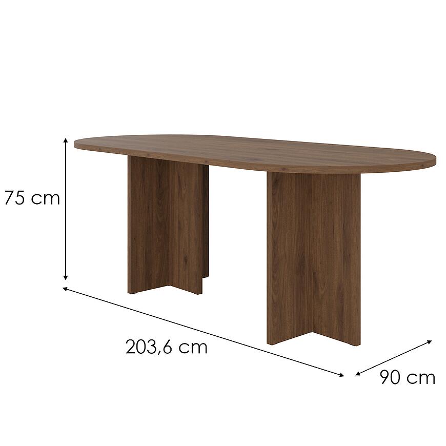 Owalny kształt blatu nie tylko prezentuje się nowocześnie, ale również sprzyja wygodnemu użytkowaniu. Brak ostrych krawędzi sprawia, że stół Loen jest bezpiecznym wyborem do domów, w których liczy się komfort codziennego życia. Szerokość 90 cm oraz długość 203,6 cm zapewniają odpowiednią przestrzeń dla kilku osób, umożliwiając swobodne spożywanie posiłków czy spotkania w gronie bliskich.