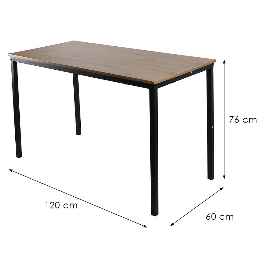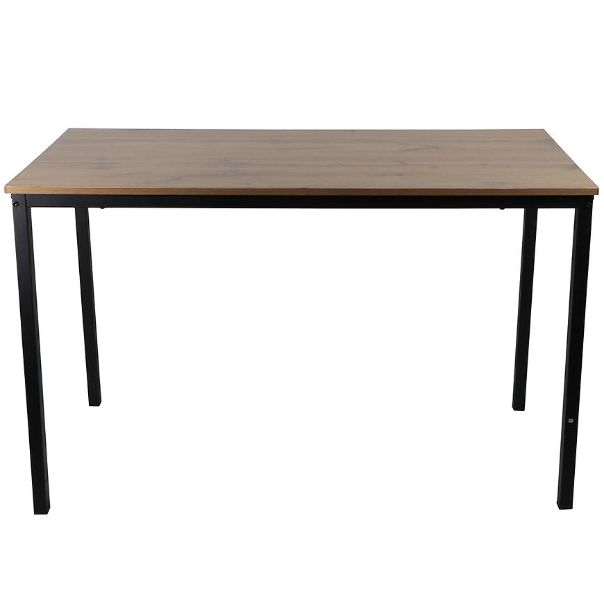 Blat stołu wykonany jest z wysokiej jakości płyty wiórowej laminowanej o matowym wykończeniu, które dodaje mu elegancji i zapewnia trwałość oraz odporność na codzienne użytkowanie. Jego kolorystyka podkreśla industrialny charakter stołu, tworząc ciekawe zestawienie z metalowym stelażem w czarnym kolorze. Solidna, stalowa konstrukcja zapewnia stabilność i wytrzymałość, dzięki czemu stół sprawdzi się zarówno w jadalni, kuchni, jak i przestrzeniach biurowych.