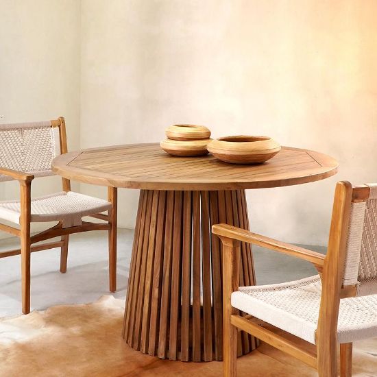 Naturalne drewno teakowe dodaje meblowi uroku i ciepła, wpisując się zarówno w nowoczesne, jak i klasyczne aranżacje. Drewno teakowe jest niezwykle odporne na warunki atmosferyczne, co sprawia, że stół Maria doskonale sprawdzi się zarówno we wnętrzach, jak i w ogrodach. Okrągły blat zapewnia komfortowe użytkowanie i jest idealny na różne okazje. Podstawa w kształcie ściętego stożka to nie tylko estetyczny akcent, ale również element konstrukcyjny, który zapewnia stabilność.