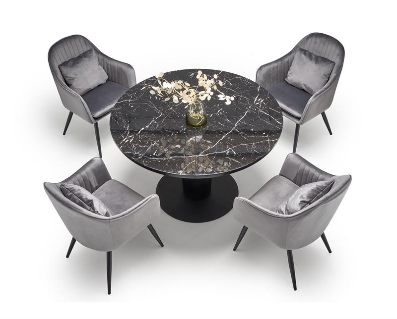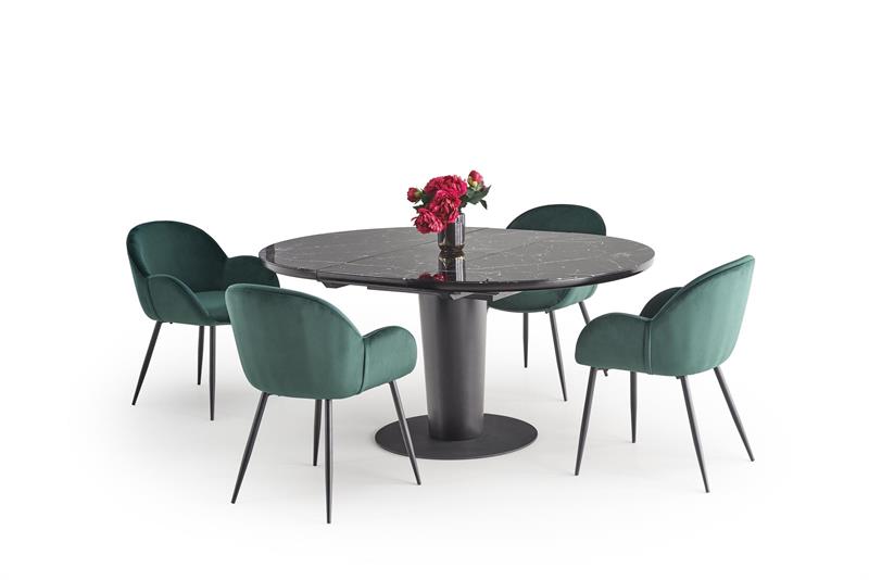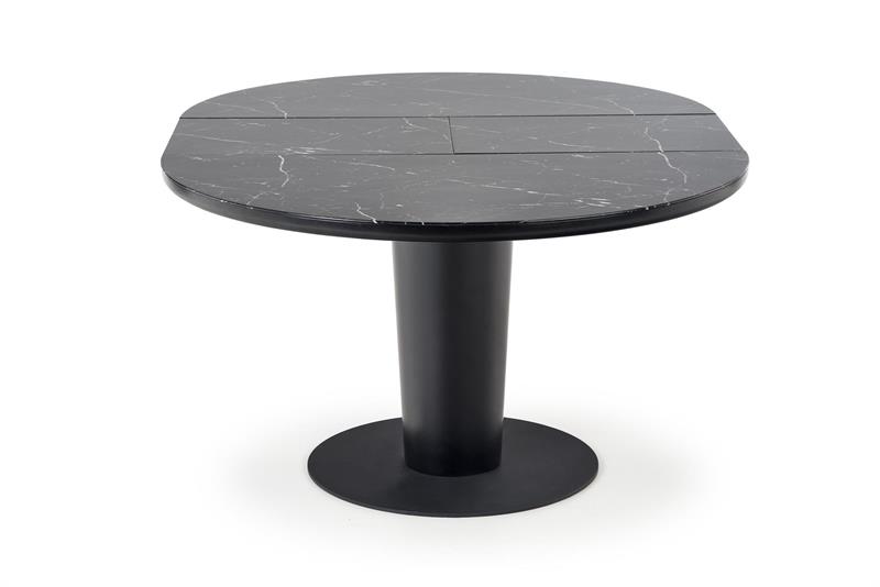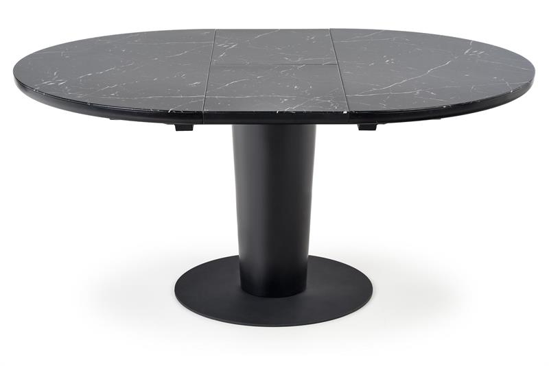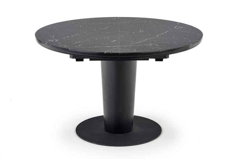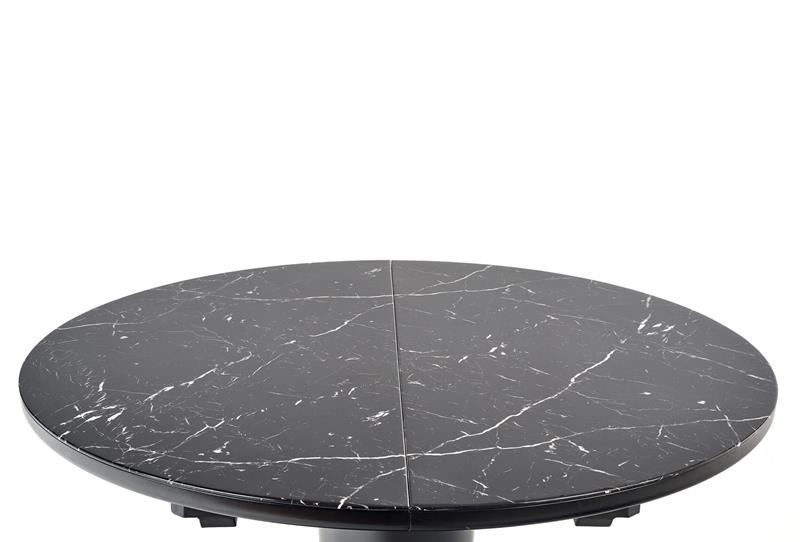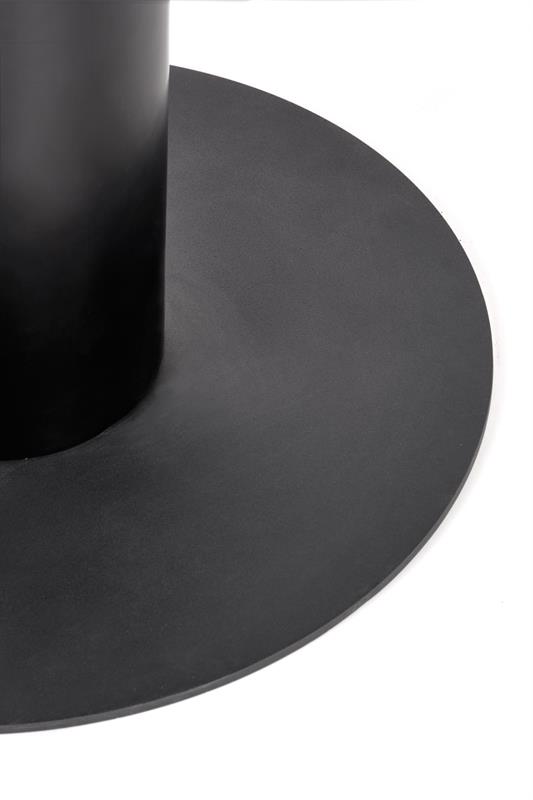 Blat stołu został wykonany z połączenia szkła i płyty MDF, co zapewnia nie tylko estetyczny wygląd, ale także trwałość i solidność konstrukcji. Czarny kolor blatu dodaje mu elegancji i stylu, jednocześnie nadając pomieszczeniu wyjątkowego charakteru. Noga stołu wykonana jest ze stali, która zapewnia nie tylko wytrzymałość, ale również chroni przed zarysowaniami i uszkodzeniami.