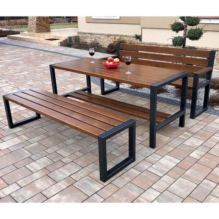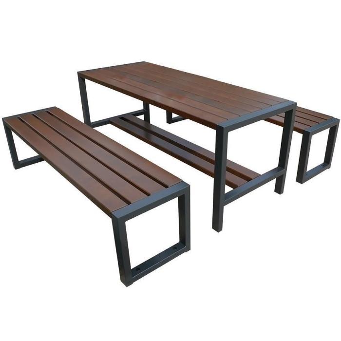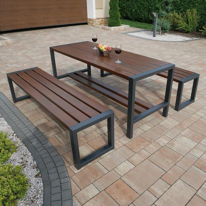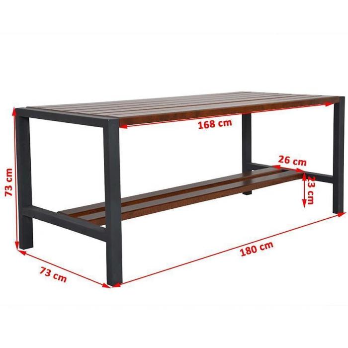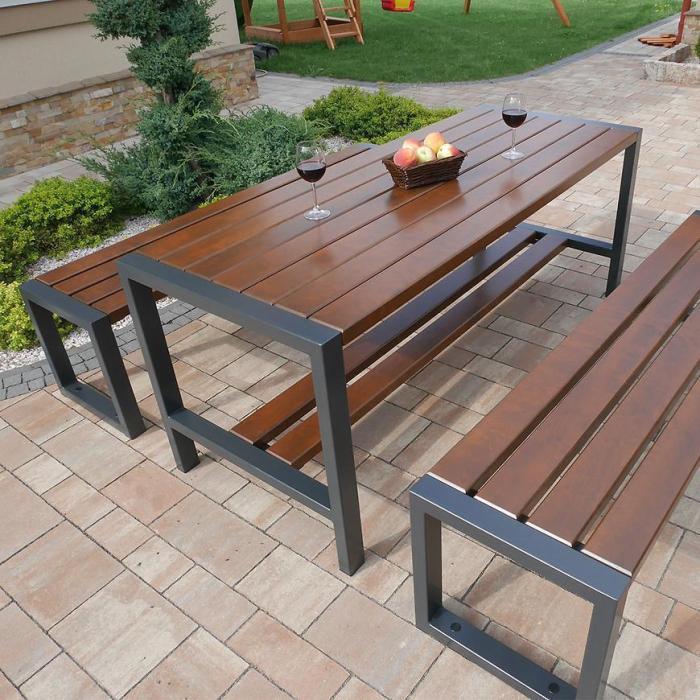Stół idealnie wpasuje się w design ogrodu, balkonu czy tarasu. Wykorzystany materiał to elementy stalowe i drewniane listwy olchowe o przekroju 40x100mm, co sprawia, że stół jest wytrzymały i solidny. Drewno zostało zabezpieczone środkami chroniącymi. Profile stalowe są ocynkowane i malowane proszkowo. Dodatkowo stół wyposażono w płaskowniki, które uniemożliwiają wygięcia się elementów drewnianych.