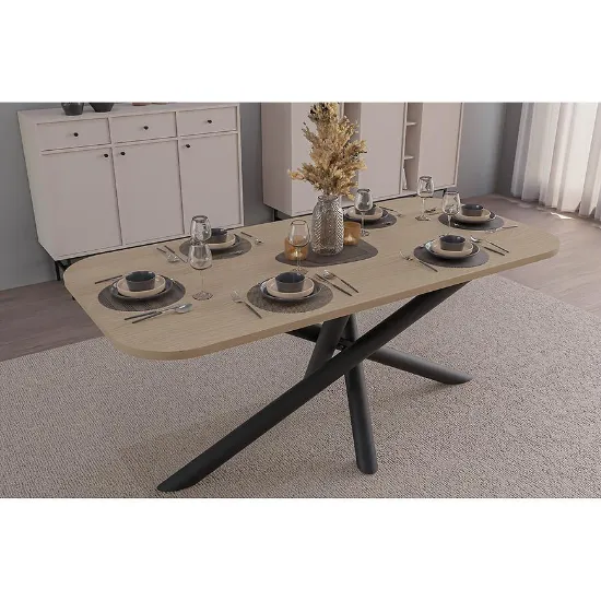 Blat stołu został wykonany z trwałej płyty wiórowej laminowanej, odpornej na zarysowania i łatwej w utrzymaniu czystości. Ciepły odcień Dąb Artisan wprowadza przytulny klimat, jednocześnie podkreślając nowoczesny charakter mebla. Solidny metalowy stelaż gwarantuje stabilność oraz długowieczność użytkowania.