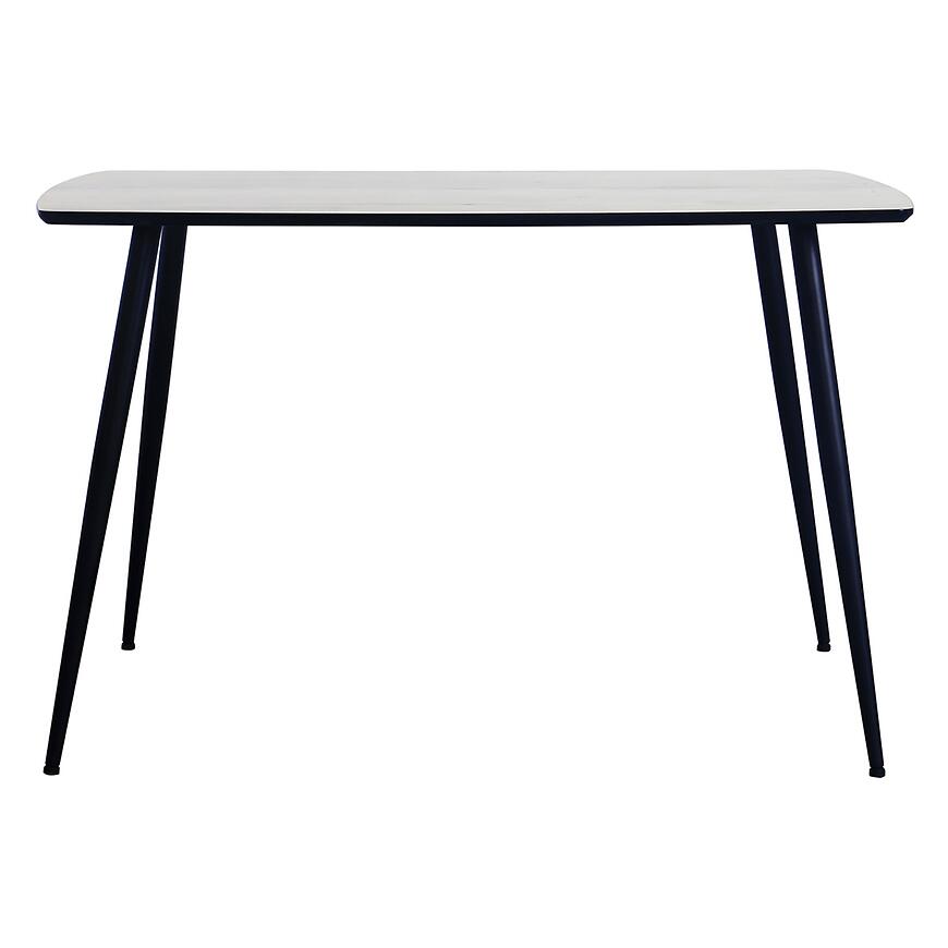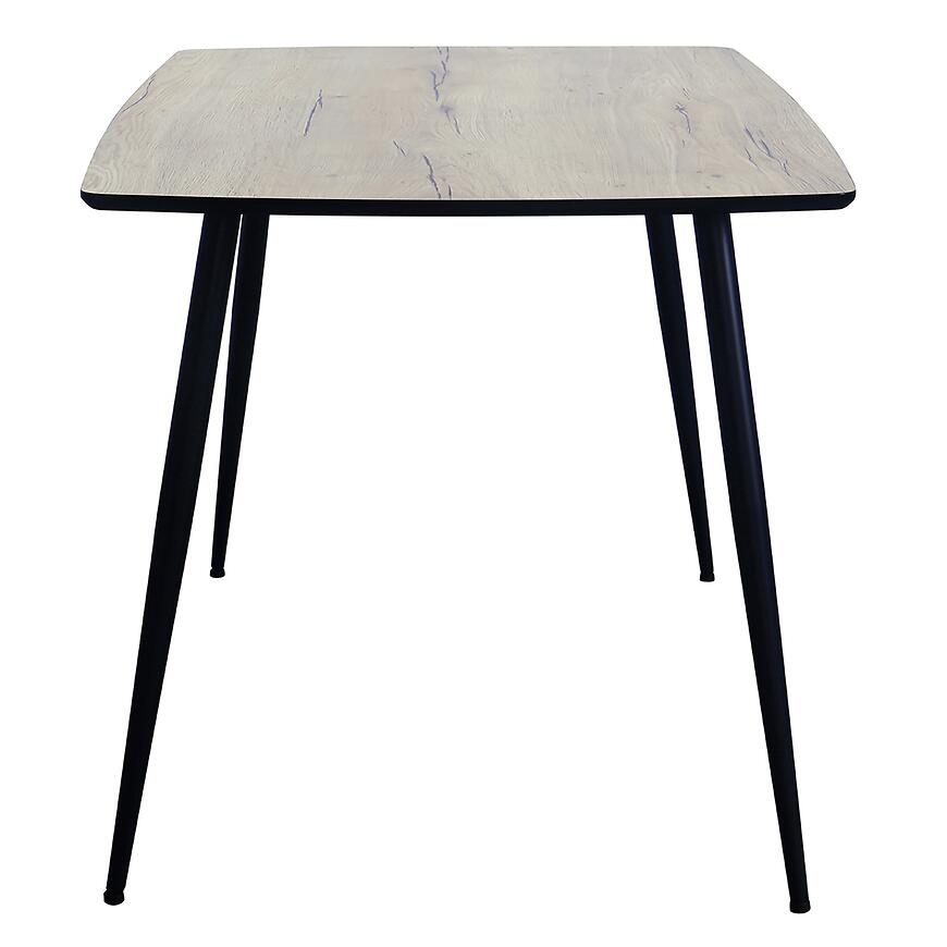 Blat stołu został wykonany z płyty MDF, natomiast stabilny stelaż z czarnego metalu gwarantuje wytrzymałość i odporność na codzienne użytkowanie. Takie połączenie materiałów sprawia, że stół jest trwały i jednocześnie prezentuje elegancki kontrast pomiędzy jasnym drewnem a ciemnym stelażem.