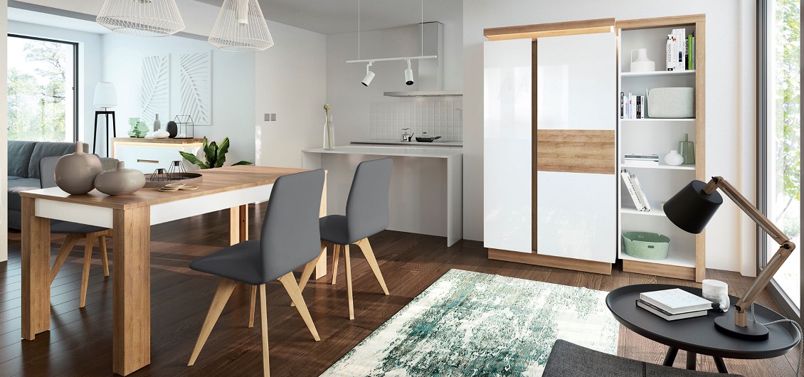 Kolekcja mebli Lyon to propozycja stworzona z myślą o nowoczesnych wnętrzach, które potrzebują subtelnej elegancji i praktycznych rozwiązań. Połączenie ciepłego dekoru dąb riviera jasny z gładkimi frontami w białym połysku to ponadczasowy duet, który doskonale odnajdzie się zarówno w przestronnych salonach, jak i eleganckich jadalniach.