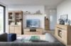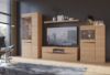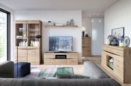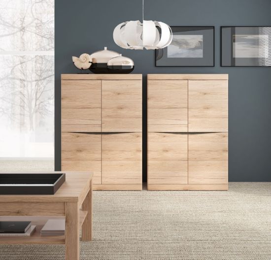 Efektowny, drewnopodobny dekor zachwyca realistycznym usłojeniem, które przywołuje na myśl ciepło natury. Kontrastowe wcięcia, pełniące rolę uchwytów, dodają kolekcji wyrazistego charakteru i podkreślają nowoczesną linię mebli. Przykuwają uwagę także szerokie poziome listwy, które świetnie współgrają z masywnymi frontami wykonanymi z trwałego MDF-u.