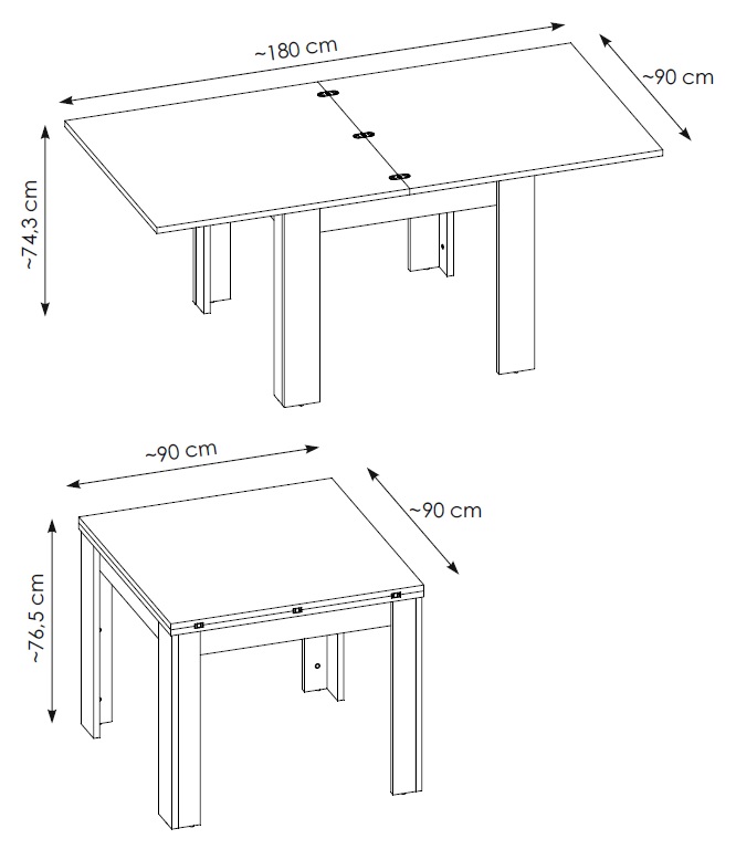 Na co dzień stół Shetland ma wymiary 90 × 90 cm, dzięki czemu świetnie sprawdza się w niewielkich jadalniach, kuchniach czy salonach. Wystarczy jednak kilka prostych ruchów, aby rozłożyć blat do 180 cm długości, tworząc przestrzeń, przy której komfortowo zasiądzie większa liczba osób. To idealne rozwiązanie na rodzinne obiady, spotkania świąteczne czy wieczory w gronie przyjaciół.