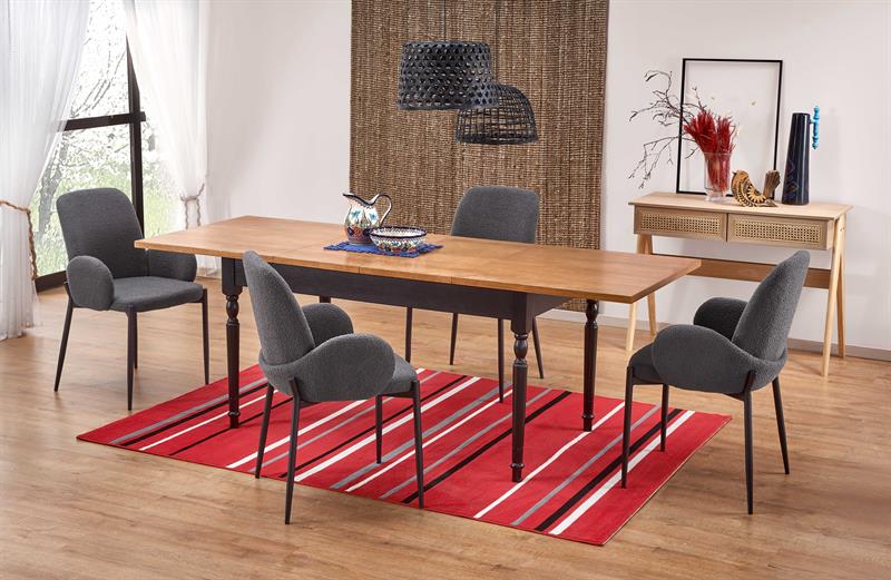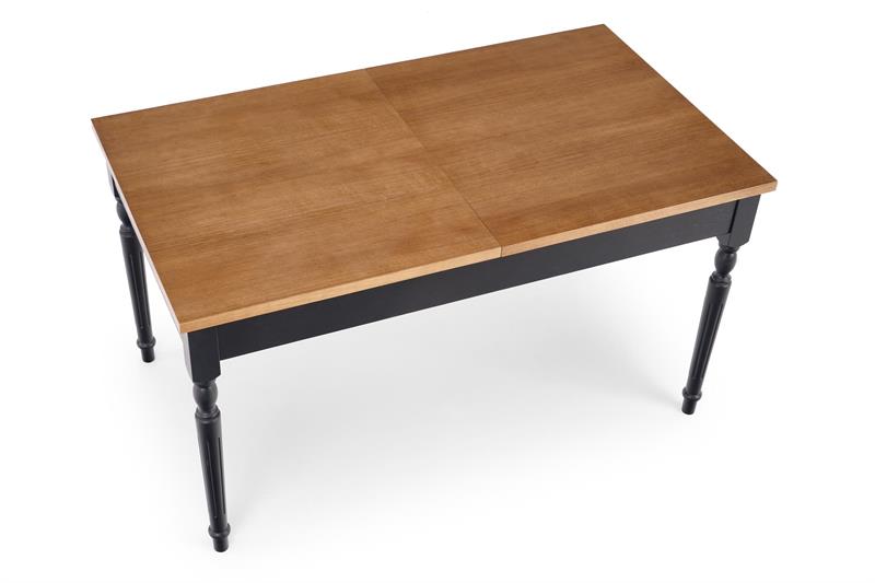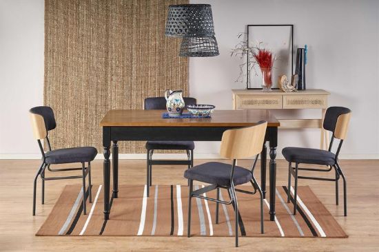 Stół wykonany jest z wysokiej jakości materiałów, które gwarantują trwałość i solidność konstrukcji. Blat w kolorze ciemny dąb dodaje mu naturalnego uroku i ciepła, tworząc przyjemną atmosferę w pomieszczeniu. Kolor ten jest ponadczasowy i łatwo dopasowuje się do różnych stylów wnętrz. Nogi stołu w kolorze czarnym stanowią kontrastujący akcent, dodając mu nowoczesności i elegancji. Ich solidna konstrukcja zapewnia stabilność i wytrzymałość, co sprawia, że stół jest nie tylko estetyczny, ale także funkcjonalny.
