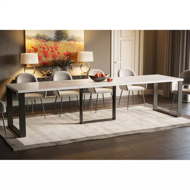 Metalowy stelaż dodaje stołowi nowoczesnego, industrialnego charakteru, podkreślając jego współczesny design. Konstrukcja ta gwarantuje nie tylko wytrzymałość, ale również stabilność, nawet przy maksymalnym rozłożeniu. Solidność stołu, który waży 113 kg, świadczy o jego wyjątkowej jakości i stabilności, co jest szczególnie ważne podczas użytkowania w większym gronie.