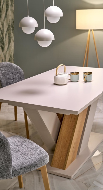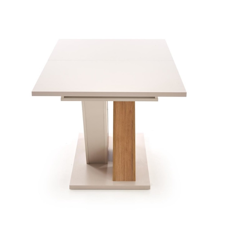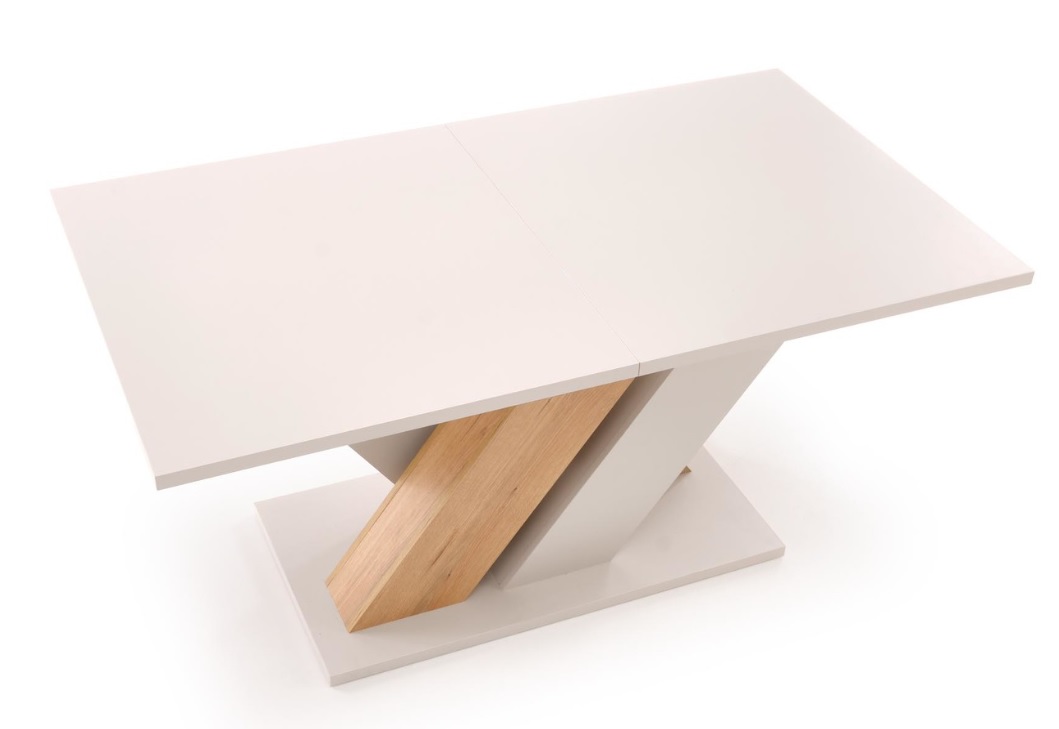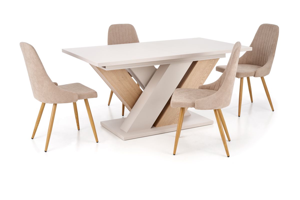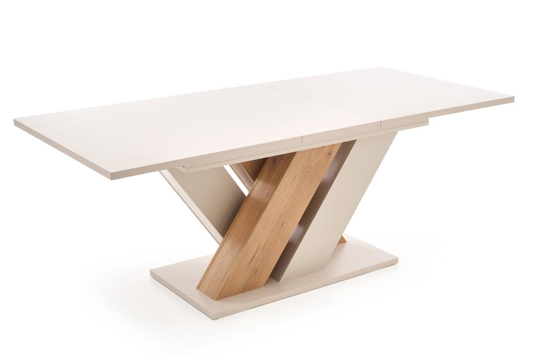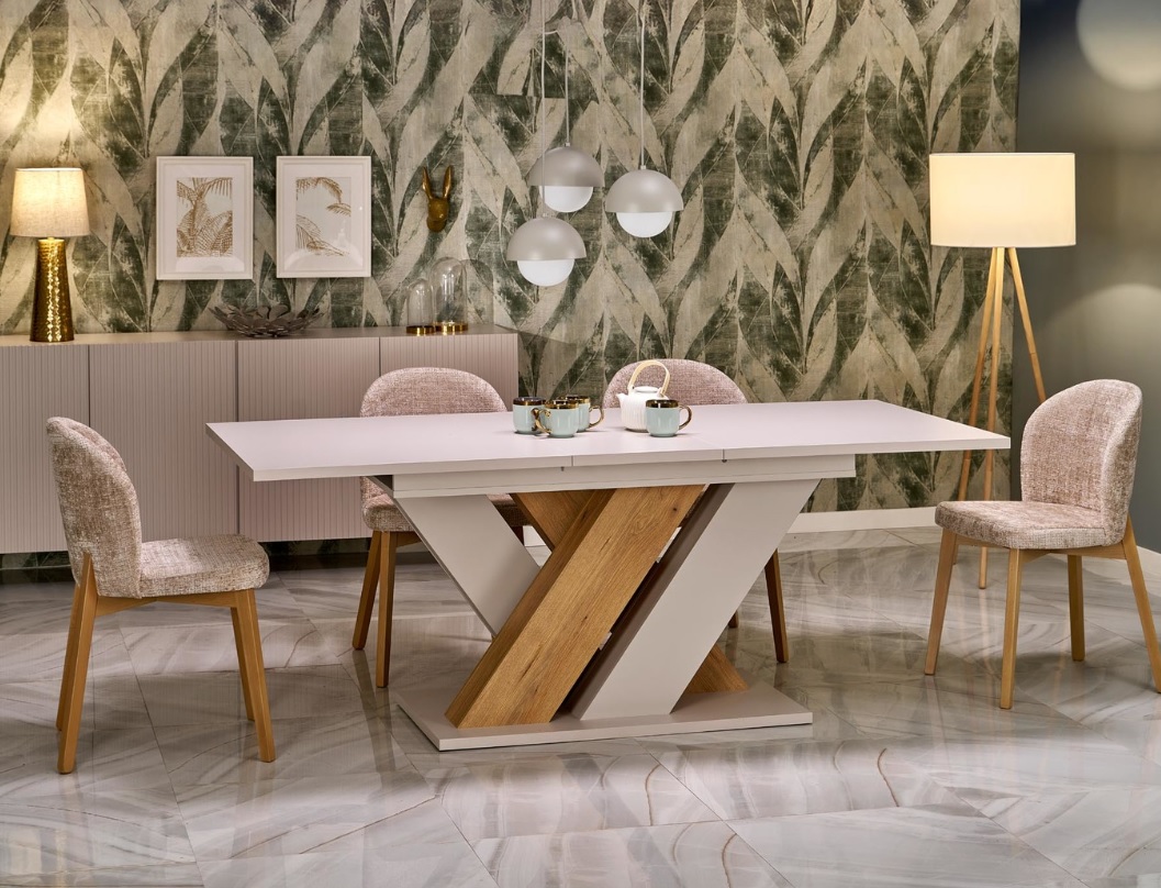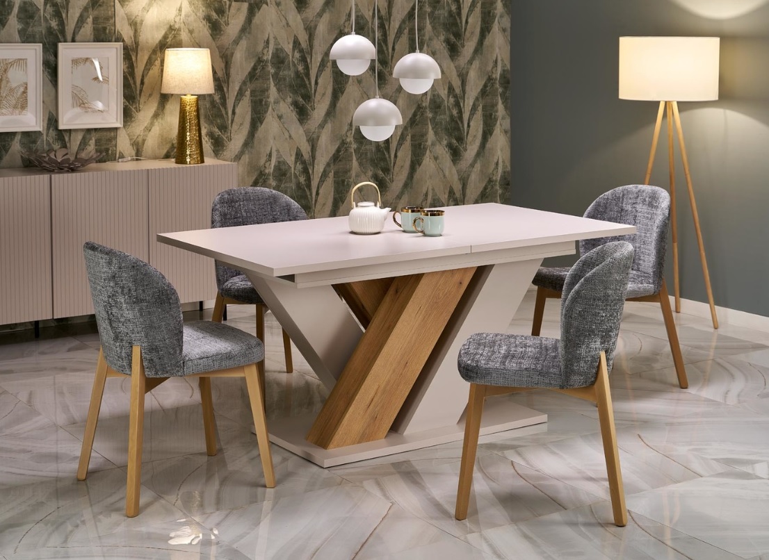 Stół rozkładany Brands to harmonijne połączenie nowoczesnego stylu z funkcjonalnością, które idealnie wpasuje się w różnorodne aranżacje wnętrz. Stół w eleganckiej kolorystyce kaszmir/dąb cremona łączy ciepło naturalnego drewna z subtelnym odcieniem beżu. Konstrukcja z laminowanej płyty meblowej cechuje się trwałością i łatwością w utrzymaniu czystości. Dużą zaletą stołu jest funkcja rozkładania, dzięki której z łatwością dopasujesz blat do bieżących potrzeb – od codziennych posiłków po większe spotkania towarzyskie.