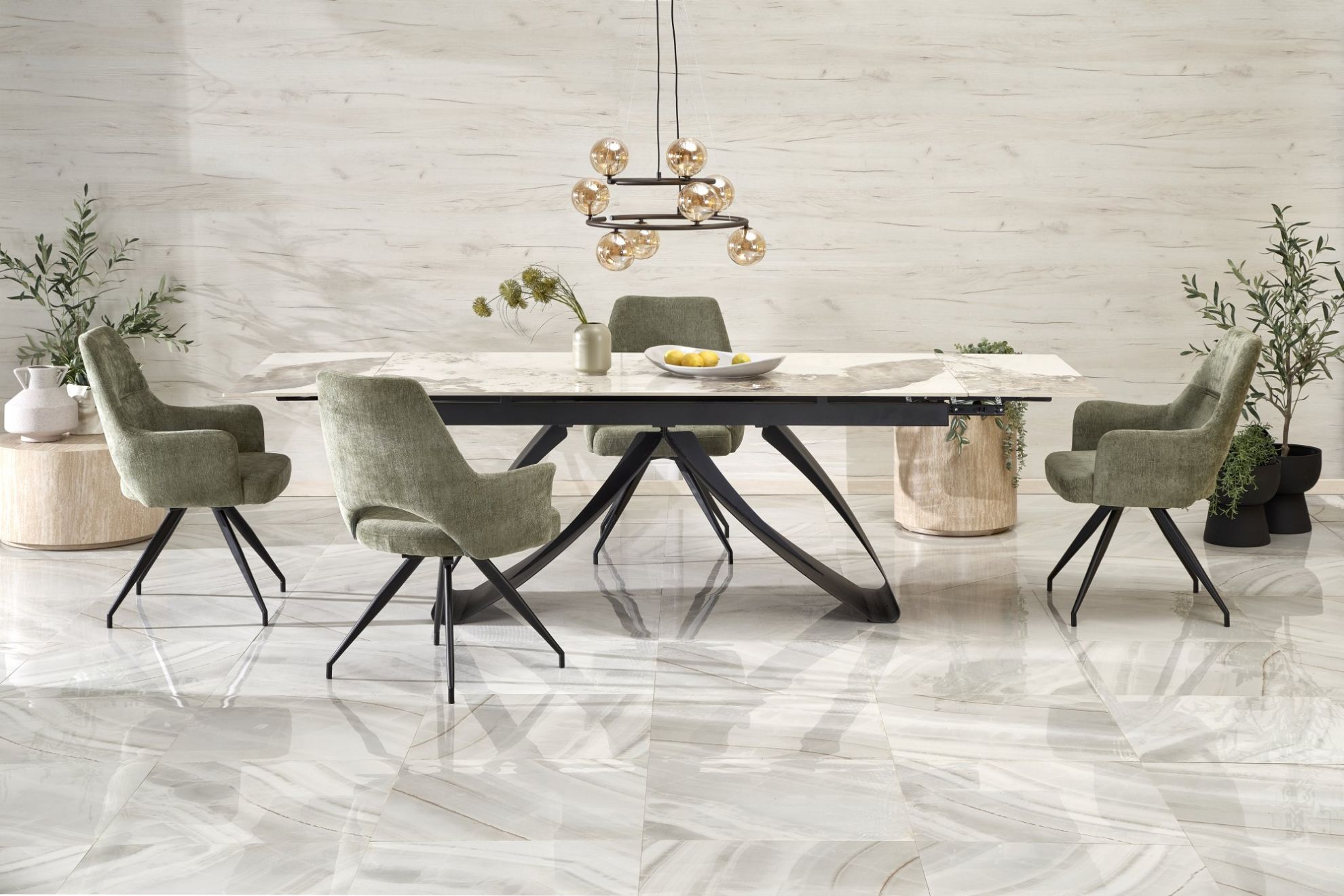 Blat stołu wykonany jest z trwałego materiału spiekowego, który imituje wygląd beżowego marmuru, nadając mu luksusowy i wyjątkowy charakter. Nogi stołu wykonane są z solidnej stali malowanej proszkowo, w kolorze czarnym, co gwarantuje stabilność i wytrzymałość konstrukcji.
