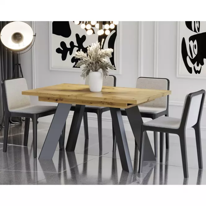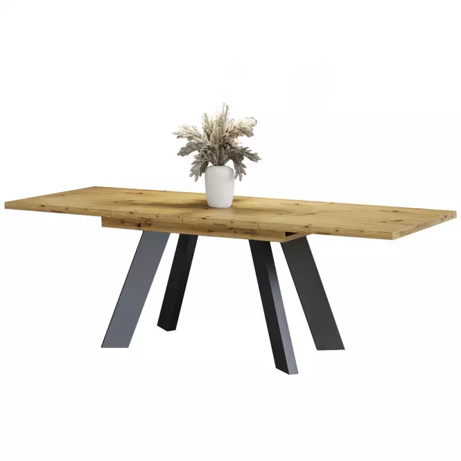 Stabilność konstrukcji zapewnia metalowy stelaż, który dodaje nowoczesnego akcentu i podkreśla wyjątkowy design mebla. Metalowe elementy tworzą stylowy kontrast z ciepłym wykończeniem płyty wiórowej, co sprawia, że stół doskonale komponuje się z różnymi aranżacjami wnętrz – od minimalistycznych po bardziej eklektyczne. Całość jest stabilna i solidna, co zapewnia użytkownikom komfort i bezpieczeństwo podczas korzystania z mebla.