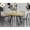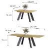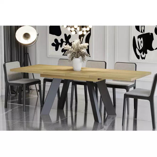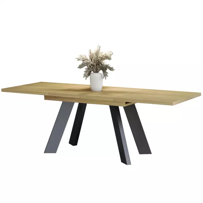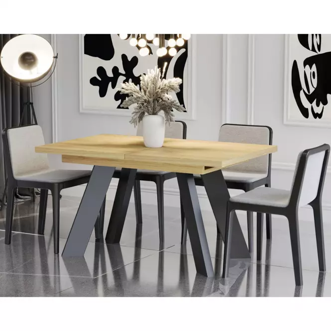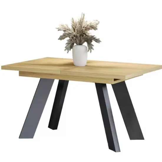 Stabilność konstrukcji zapewnia metalowy stelaż, który dodaje nowoczesnego akcentu i podkreśla wyjątkowy design mebla. Metalowe elementy tworzą stylowy kontrast z ciepłym wykończeniem płyty wiórowej, co sprawia, że stół doskonale komponuje się z różnymi aranżacjami wnętrz – od minimalistycznych po bardziej eklektyczne. Całość jest stabilna i solidna, co zapewnia użytkownikom komfort i bezpieczeństwo podczas korzystania z mebla.