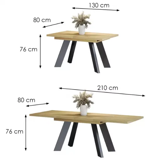 Wyjątkową cechą tego stołu jest jego funkcja rozkładania – długość blatu przed rozłożeniem wynosi 130 cm, co zapewnia przestrzeń na codzienne posiłki, a po rozłożeniu osiąga imponujące 210 cm, co umożliwia wygodne goszczenie większej liczby osób. Dzięki temu stół Como-210 sprawdzi się zarówno podczas codziennych obiadów, jak i większych uroczystości, gdzie potrzebna jest dodatkowa przestrzeń.