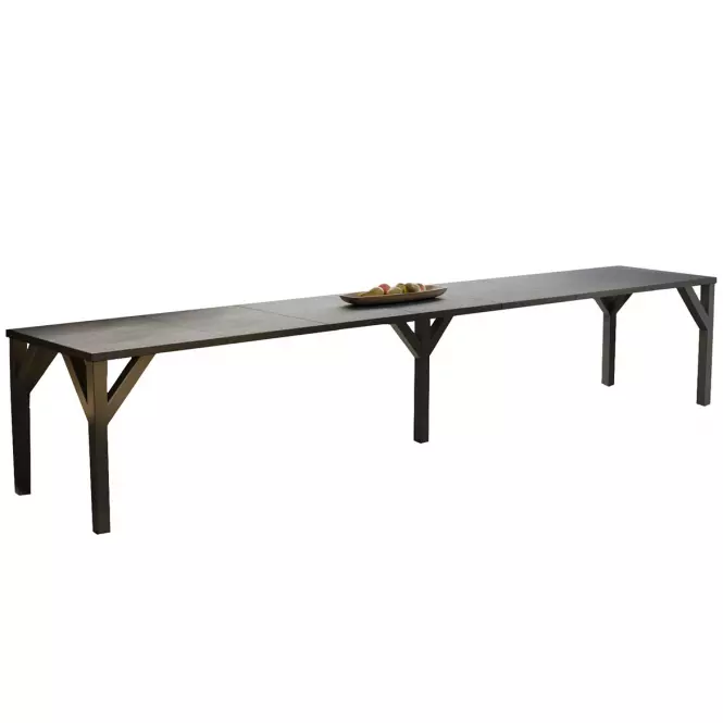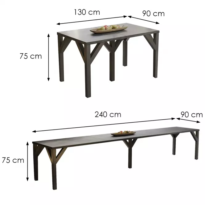 Stabilność konstrukcji zapewnia metalowy stelaż, który harmonijnie współgra z betonowym odcieniem blatu, tworząc spójne i nowoczesne połączenie. Metalowe elementy dodają całości surowości i nowoczesnego charakteru, jednocześnie gwarantując solidne oparcie nawet przy maksymalnym rozłożeniu stołu.