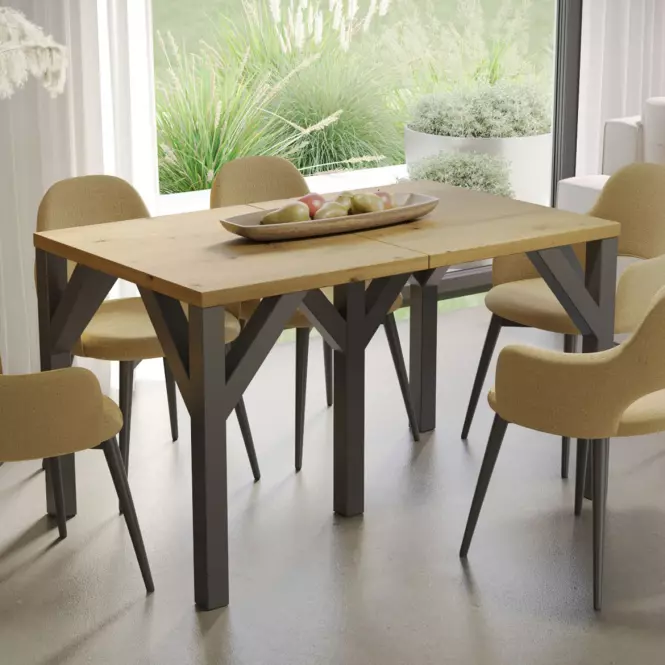 Stabilność konstrukcji zapewnia metalowy stelaż, który harmonijnie współgra z betonowym odcieniem blatu, tworząc spójne i nowoczesne połączenie. Metalowe elementy dodają całości surowości i nowoczesnego charakteru, jednocześnie gwarantując solidne oparcie nawet przy maksymalnym rozłożeniu stołu.