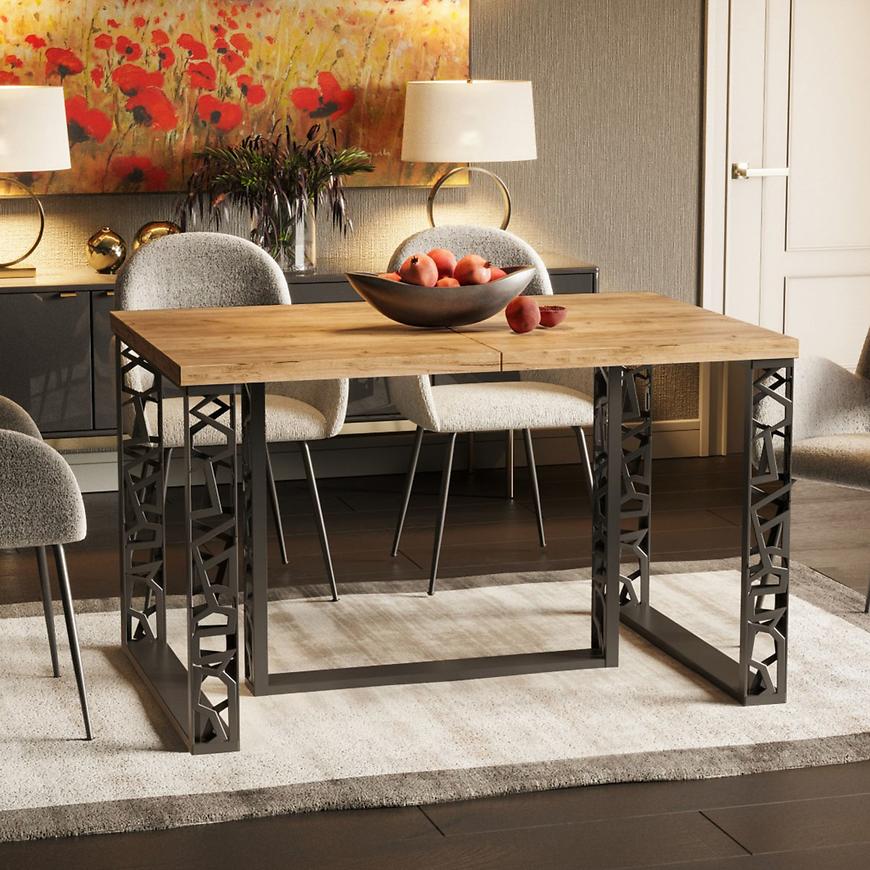 Blat wykonany został z wysokiej jakości płyty wiórowej, która charakteryzuje się wytrzymałością i trwałością, jednocześnie zachowując estetyczny wygląd na długie lata. Matowe wykończenie dodaje mu elegancji i nadaje nowoczesny charakter, a także sprawia, że jest łatwy w pielęgnacji i odporny na codzienne użytkowanie. Stelaż stołu wykonano z metalu, co gwarantuje stabilność oraz wytrzymałość konstrukcji, zapewniając solidne wsparcie nawet przy pełnym rozłożeniu.