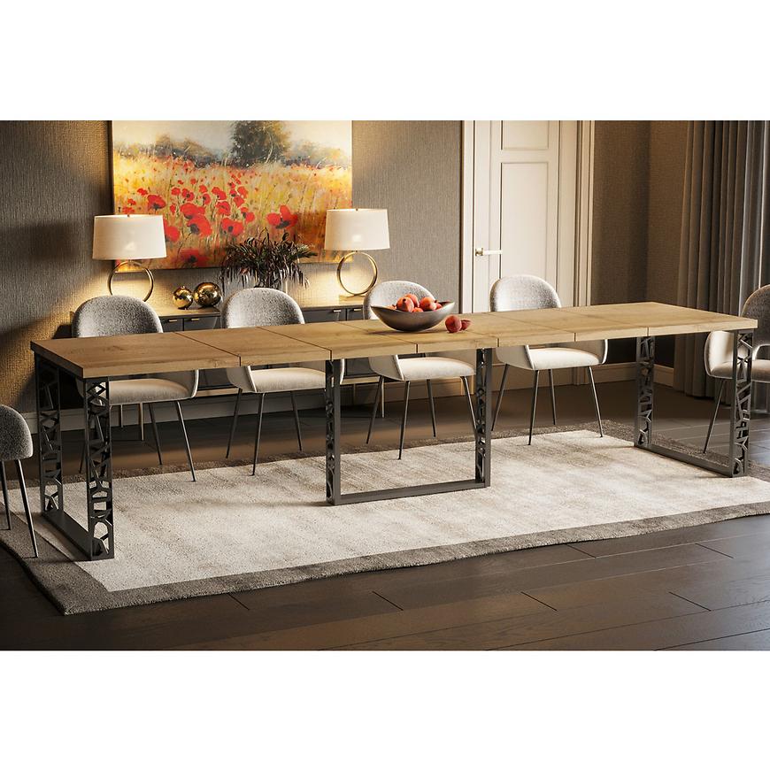 Blat wykonany został z wysokiej jakości płyty wiórowej, która charakteryzuje się wytrzymałością i trwałością, jednocześnie zachowując estetyczny wygląd na długie lata. Wykończenie dodaje mu elegancji i nadaje nowoczesny charakter, a także sprawia, że jest łatwy w pielęgnacji i odporny na codzienne użytkowanie. Stelaż stołu wykonano z metalu, co gwarantuje stabilność oraz wytrzymałość konstrukcji, zapewniając solidne wsparcie nawet przy pełnym rozłożeniu.