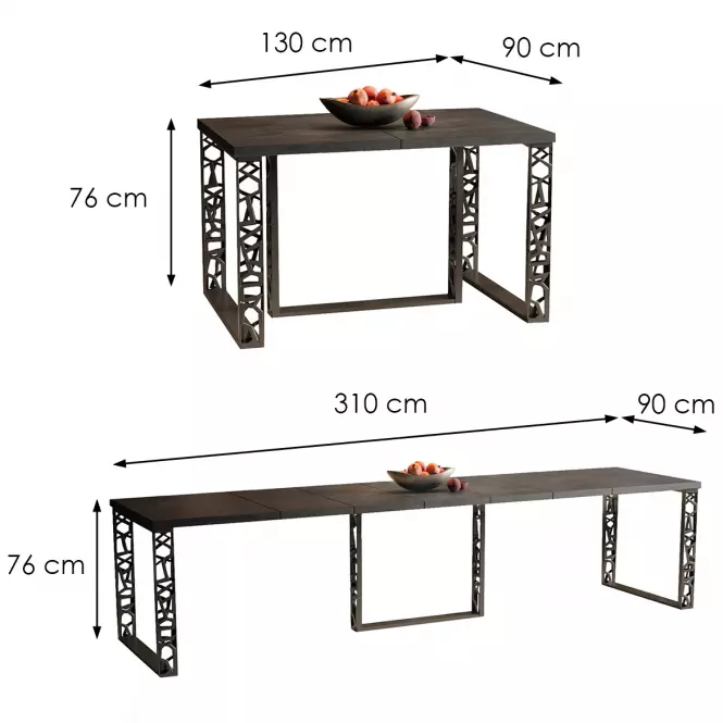 Stół rozkładany Ewerest Bis 310 to elegancki i nowoczesny mebel, który doskonale sprawdzi się w przestronnych wnętrzach i wszędzie tam, gdzie potrzeba elastyczności w aranżacji. Dzięki swojej imponującej rozpiętości – od kompaktowych 130 cm aż do 310 cm po pełnym rozłożeniu – ten model umożliwia komfortowe korzystanie na co dzień, a w razie potrzeby staje się centrum rodzinnych uroczystości, spotkań towarzyskich czy przyjęć. Z szerokością 90 cm blat oferuje optymalną przestrzeń na posiłki, dekoracje i niezbędne przedmioty, zachowując jednocześnie wygodę i funkcjonalność nawet przy pełnym rozłożeniu.