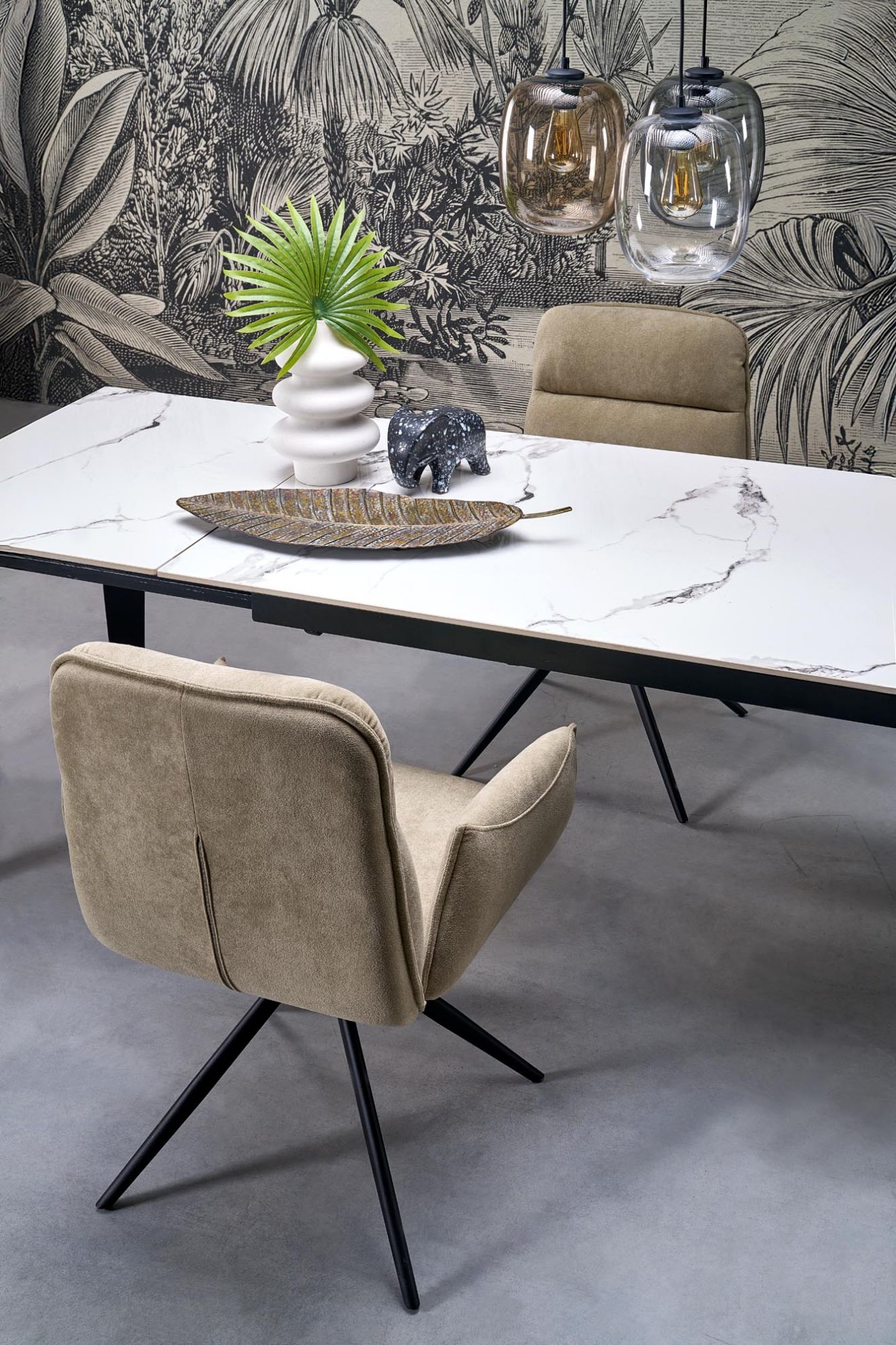 Stół rozkładany Feren łączy nowoczesny design z praktycznością. Blat wykonany ze spieku w kolorze białego marmuru zapewnia elegancki wygląd i trwałość, a czarny stalowy stelaż malowany proszkowo gwarantuje stabilność. Mechanizm rozkładania pozwala dopasować stół do liczby gości, obsługując 6 do 8 osób.