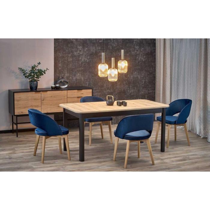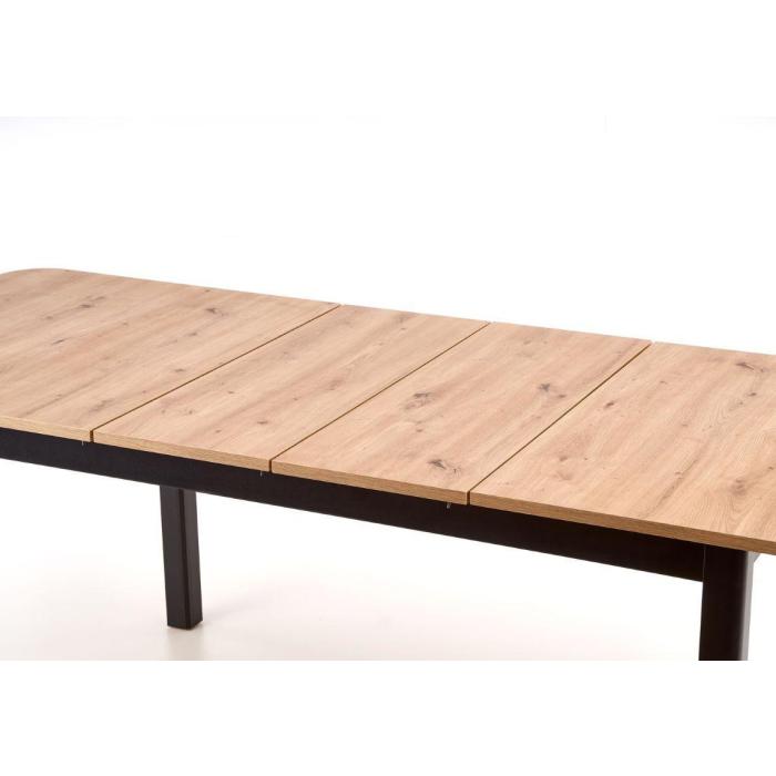 Rozkładany stół w stylu loftowym do jadalni i salonu. Blat stołu został wykonany z płyty meblowej okleinowanej a cztery nogi zapewniające podporę - z płyty meblowej. Stół dostępny w kolorze - blat dąb artisan z czarnymi nogami oraz całość biały. Stół rozkładany sprawdzi się zarówno w małych jak i większych przestrzeniach. Stół rozkłada się za pomocą wkładki znajdującej się tuż pod blatem.