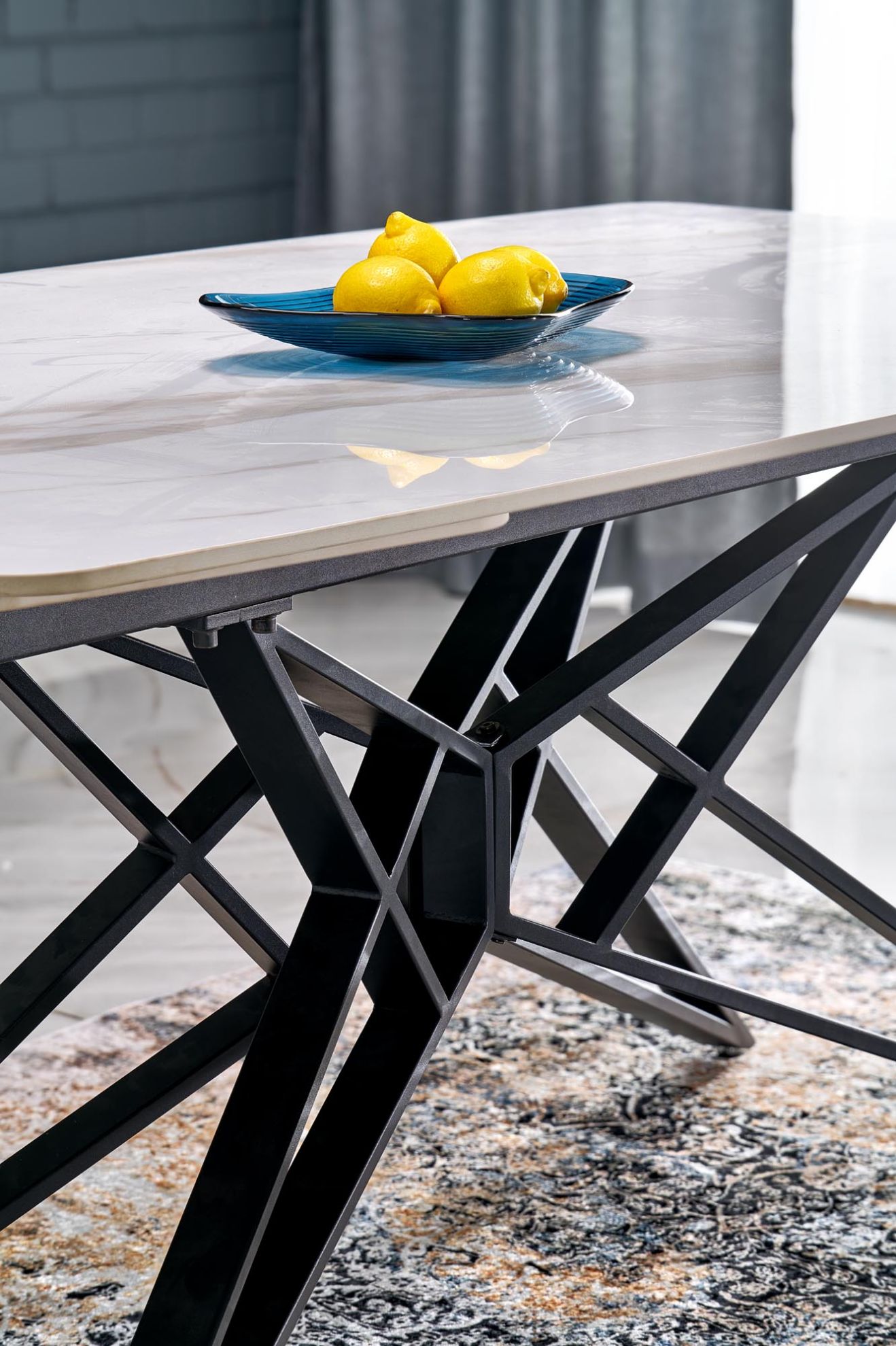 Stół rozkładany Fredo to połączenie nowoczesnego designu i funkcjonalności. Blat wykonany ze spieku w wykończeniu biały marmur na wysoki połysk nadaje meblowi elegancki charakter i zapewnia trwałość podczas codziennego użytkowania. Stabilna konstrukcja oparta na metalowym stelażu w czarnym kolorze podkreśla nowoczesny styl stołu.