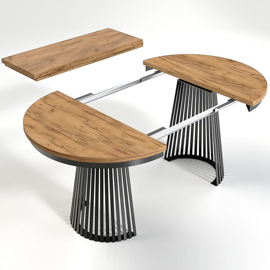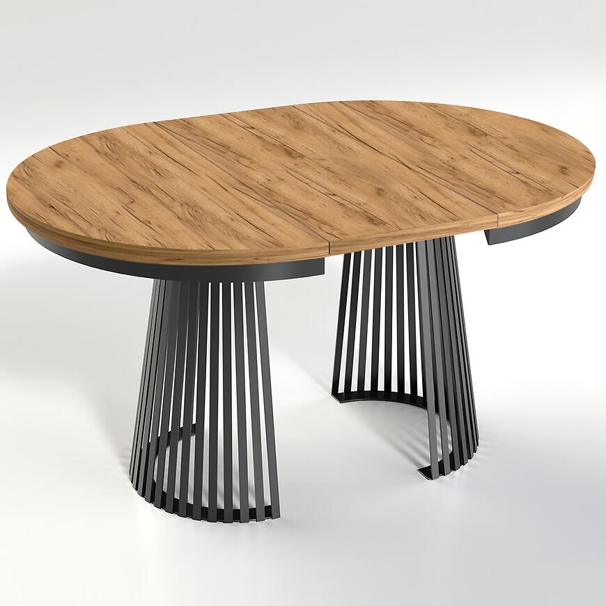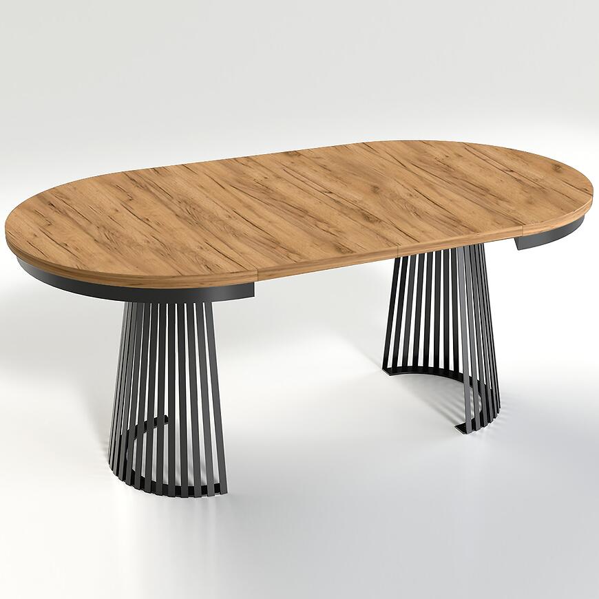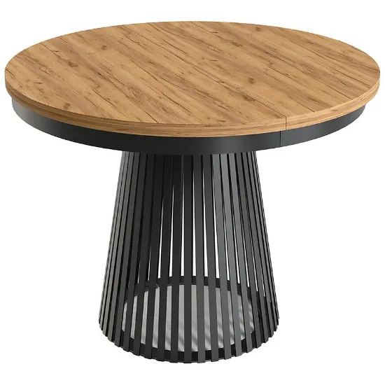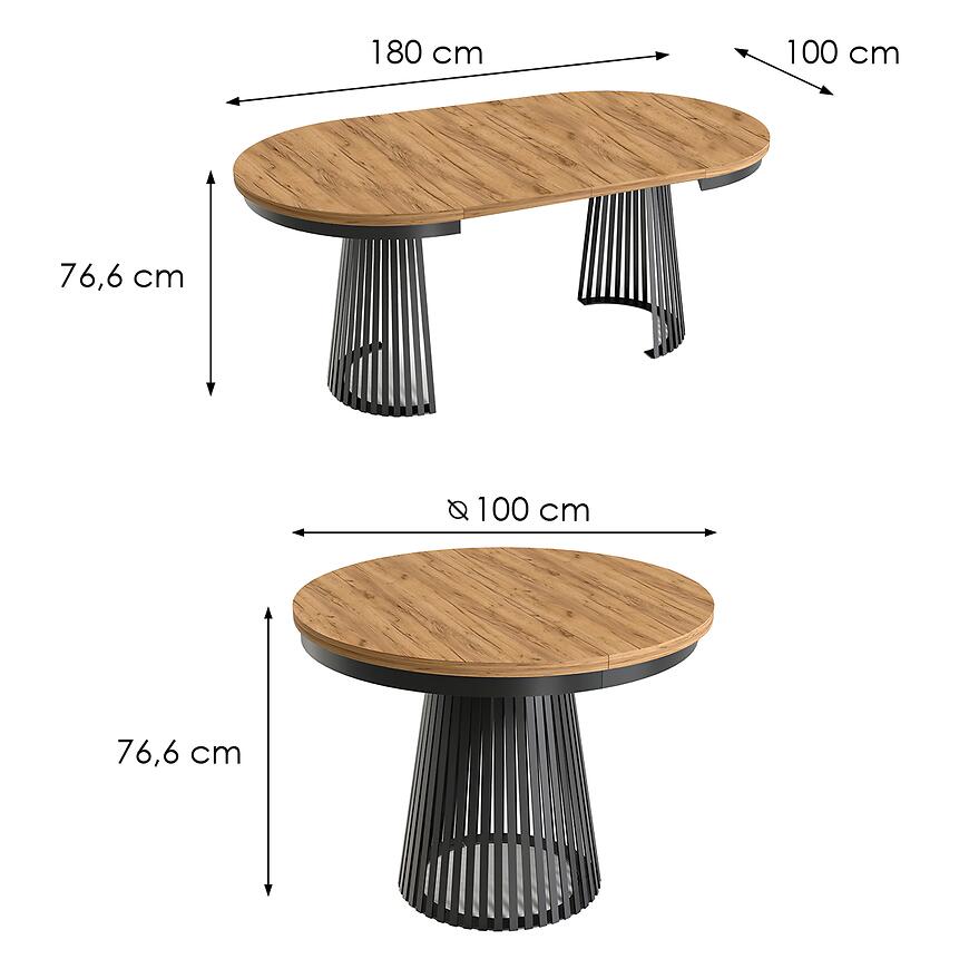 Stół Rozkładany Garda Czarny/Kraft Złoty to nowoczesny i funkcjonalny mebel w stylu loftowym, łączący eleganckie czarne wykończenie z jasnym, drewnopodobnym blatem. Blat wykonany z laminowanej płyty wiórowej, stelaż z metalu zapewniają trwałość i stabilność. Rozkładany blat zwiększa długość stołu z 100 do 180 cm, a matowe wykończenie podkreśla nowoczesny charakter. To połączenie stylu, funkcjonalności i jakości, które wyróżni każde wnętrze.