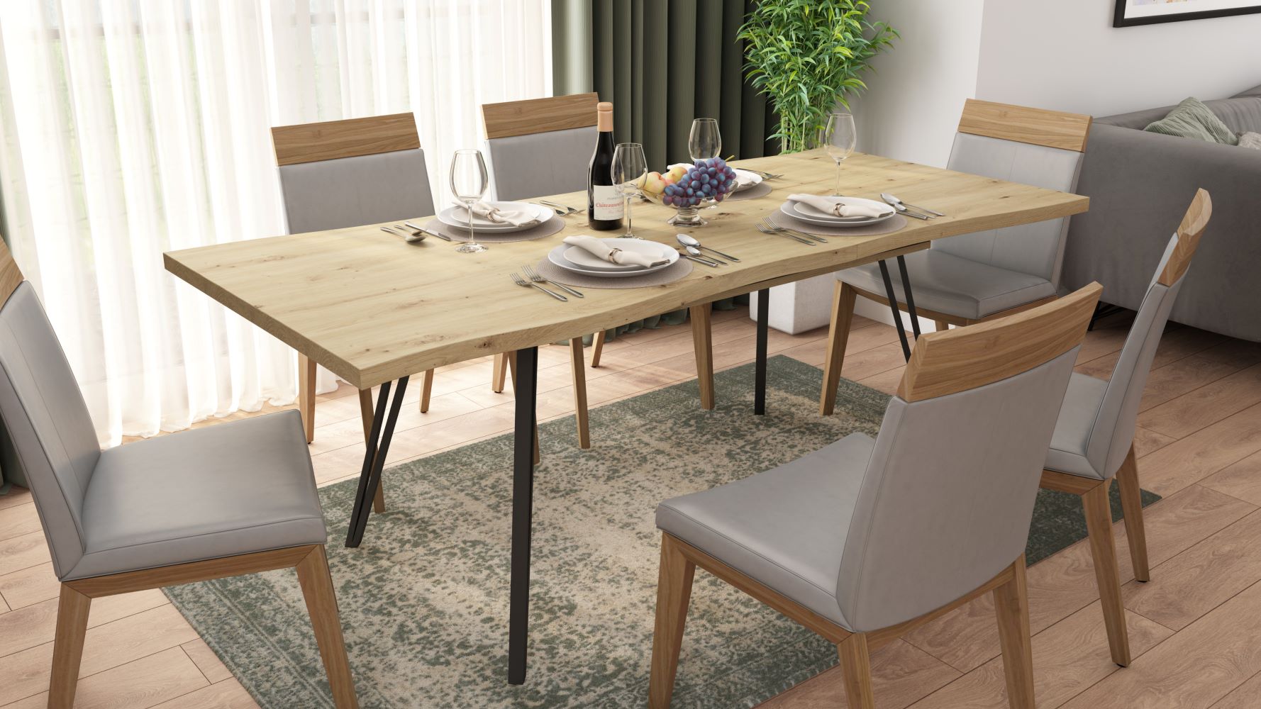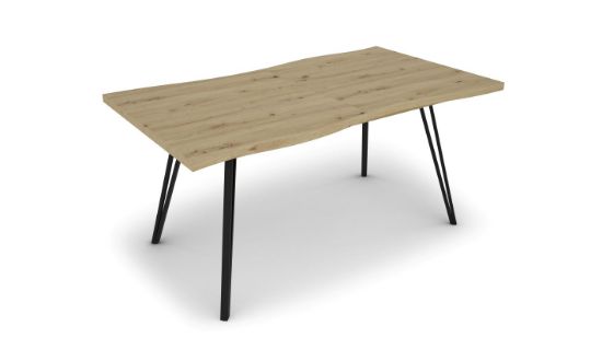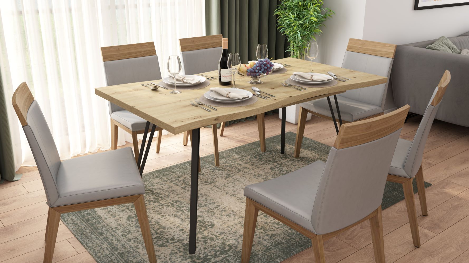 Blat stołu wykonany jest z wysokiej jakości płyty wiórowej laminowanej o grubości 18 mm, dodatkowo pogrubionej dookoła na 36 mm, co nadaje mu solidności i trwałości. Obrzeże ABS oraz krawędzie na krótkich bokach blatu z obrzeżem LIVE GRAIN sprawiają, że cały blat prezentuje się jak wycięty kawałek litego drewna, nadając wnętrzu naturalnego charakteru.