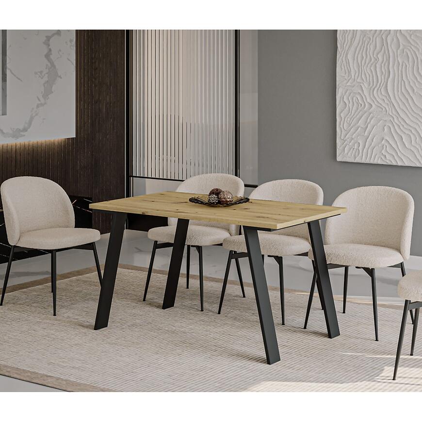 Stół rozkładany Liwia w kolorze dąb artisan to nowoczesny mebel o prostokątnym blacie wykonanym z płyty MDF z matowym wykończeniem. Jego wymiary to 80 cm szerokości, 75 cm wysokości, 130 cm długości w stanie złożonym i 210 cm po rozłożeniu. Stół wymaga złożenia i waży 53 kg.