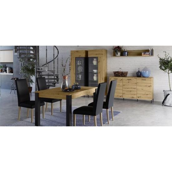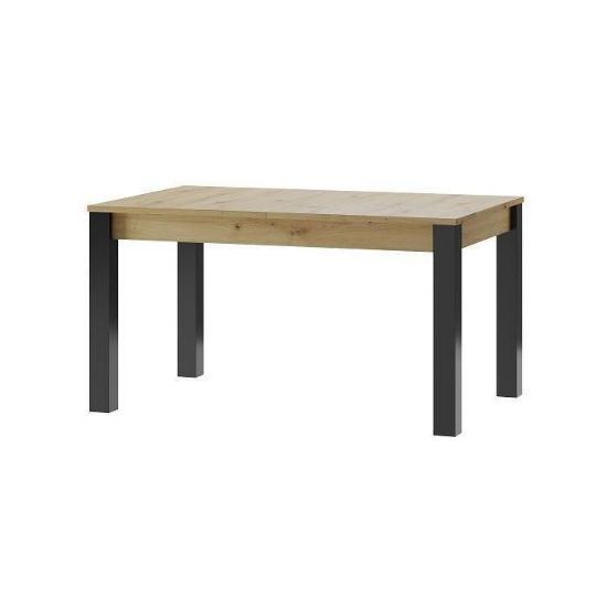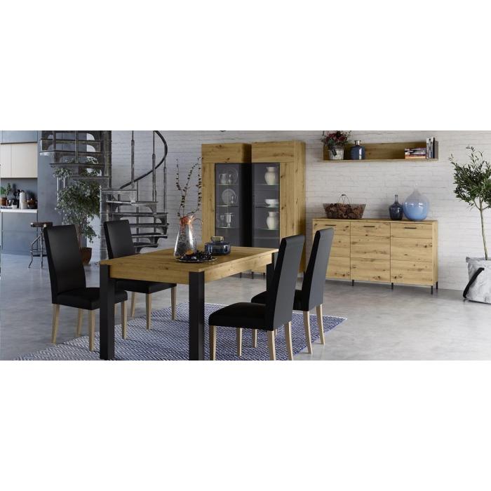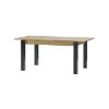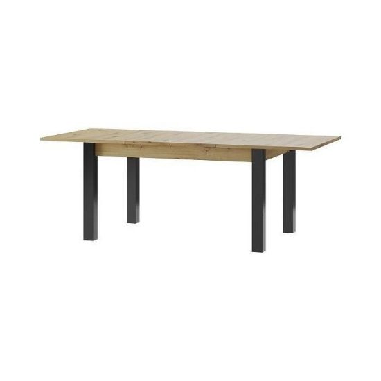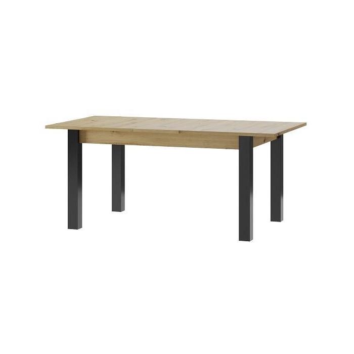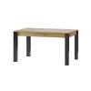 Prostokątny blat o wymiarach 140 x 90 cm wybarwiono na odcień dębu artisan, który prezentuje się oryginalnie, imitując usłojenie drewna. Mebel wykonany z płyty meblowej foliowanej. Nogi stołu wykonano w kontrastowym czarnym kolorze. Potencjał stołu Lumi pozwala na tworzenie wielu intrygujących projektów pomieszczeń. Jego istotnym atutem zwiększającym funkcjonalność jest możliwość poszerzenia blatu do 210 cm dzięki specjalnym wkładkom.
