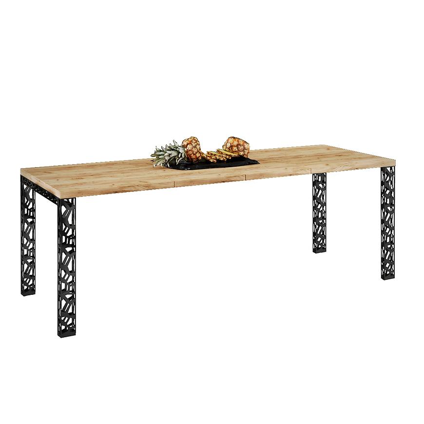 Blat wykonany z wytrzymałej płyty wiórowej zapewnia trwałość i odporność na codzienne użytkowanie. Prostokątny kształt blatu oraz minimalistyczne wykończenie sprawiają, że stół Matio będzie harmonijnie komponował się z nowoczesnymi aranżacjami wnętrz. Podstawę stołu stanowi solidny metalowy stelaż, który nie tylko dodaje całości stabilności, ale również wprowadza subtelny, industrialny akcent. Dzięki takiej konstrukcji stół jest stabilny i odporny na obciążenia, co pozwala cieszyć się jego funkcjonalnością przez długie lata.