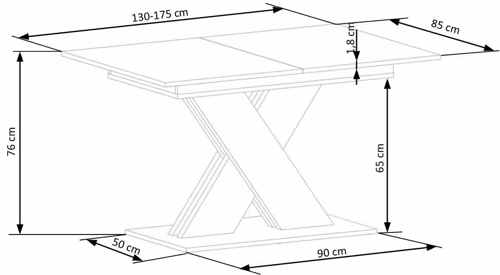 Prostokątny blat wykonany z laminowanej płyty meblowej jest trwały, odporny na codzienne użytkowanie oraz łatwy w utrzymaniu czystości. Funkcja rozkładania pozwala zwiększyć długość stołu z 130 cm do 175 cm, dzięki czemu komfortowo pomieści od 6 do 8 osób. Stabilna konstrukcja oparta na dwóch solidnych nogach zapewnia bezpieczeństwo oraz wygodę użytkowania.