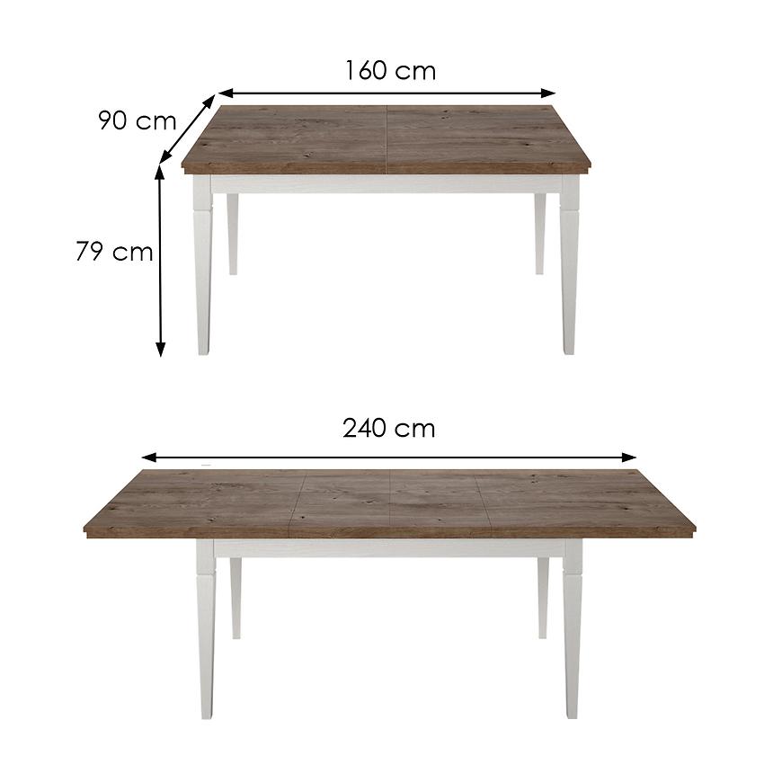 Rozkładany blat stołu pozwala na zmianę jego rozmiaru w zależności od potrzeb i liczby gości. W standardowym ustawieniu, stół ma wymiary 160x90 cm, jednak po rozłożeniu osiąga długość aż 240 cm, co sprawia, że bez problemu pomieści większą ilość osób.